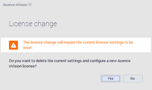 By clicking on Yes button, you will remove the currently installed license key, and the Axence Account window will be displayed (data gathered in monitoring and nVision’s configuration will be kept).