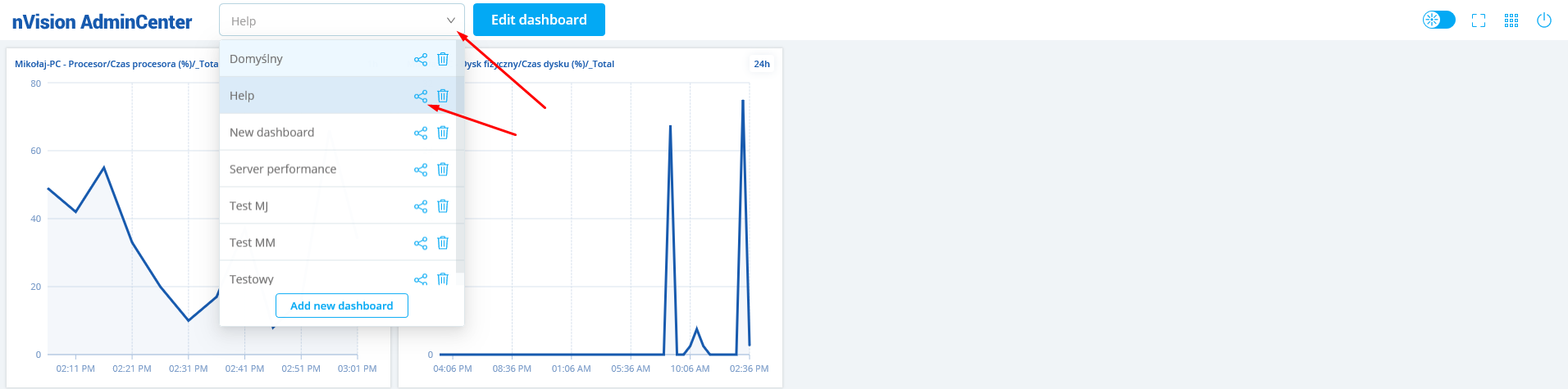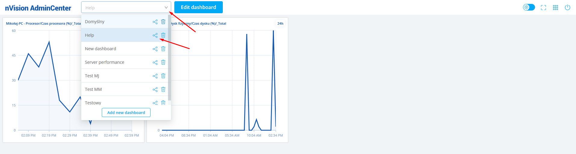 Once you have completed the steps above, the dashboard will be displayed without the ability to edit it. It is not possible to share editable dashboards. Disabling the sharing of a dashboard Disable the sharing of a dashboard in the following way: 1.Expand the list of available dashboards by clicking the box at the top of the screen. 2.Press the share button next to the dashboard which is currently shared. 3.Move the Share dashboard slider. The sharing of the dashboard will be disabled.