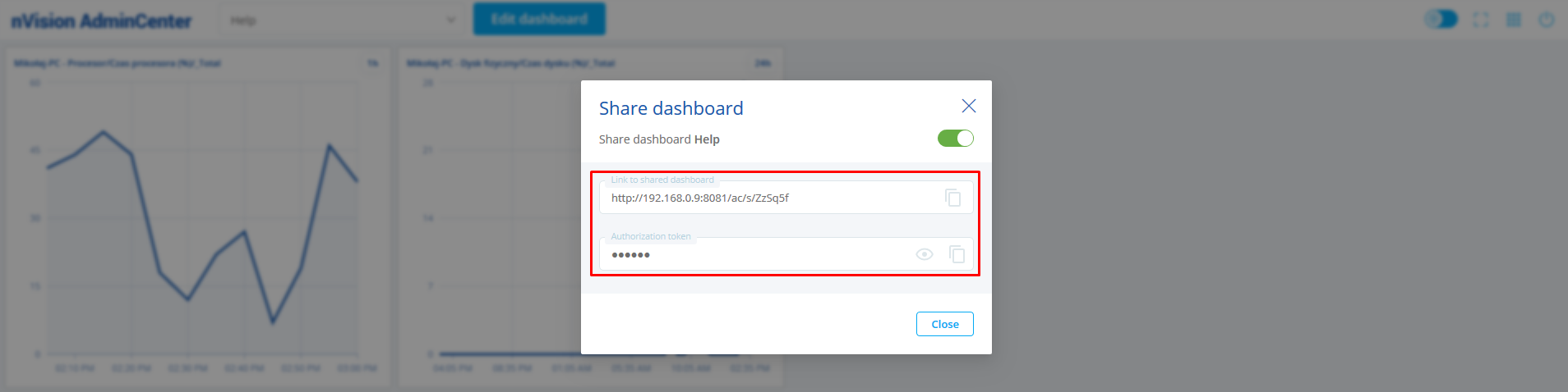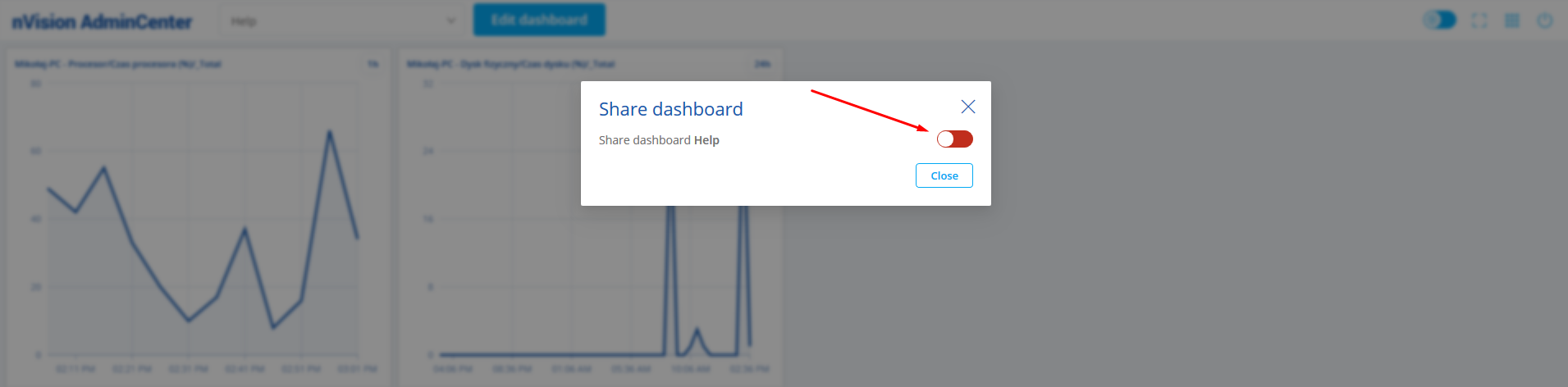 Sharing a dashboard 1.Share a dashboard in read-only mode with any user in the following way: 2.Press the share button next to the dashboard you want to share. 3.Move the Share dashboard slider. A unique link and access token allowing access to the dashboard will be displayed. 4.Copy the unique link and the access token and give them to the person who is to access the dash-board.