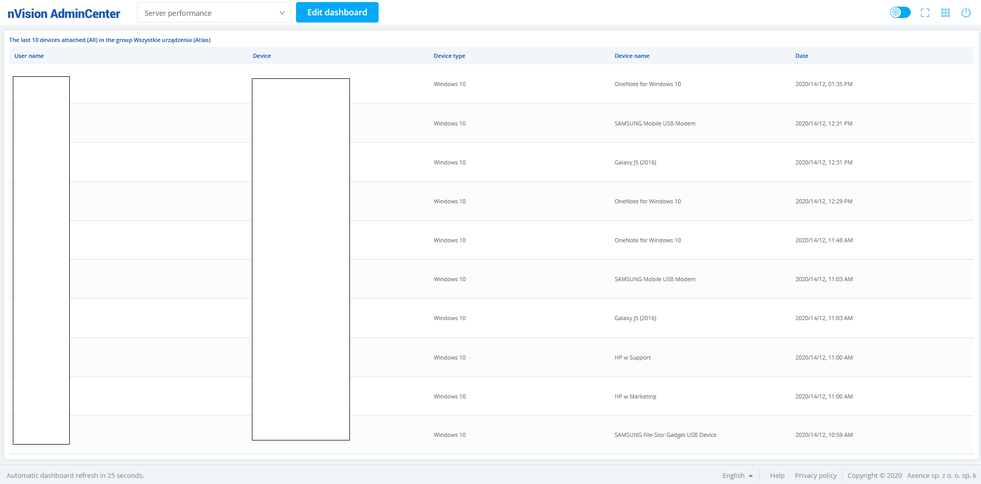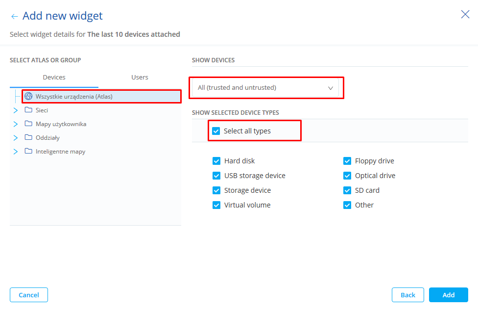 Last 10 devices attached The widget lists the last 10 devices connected to machines with Agents. The configuration requires the selection of the department or network map for which the events are to be shown. You can also narrow down the results by selecting the kind of device (trusted, untrusted, all) and the type of device (hard disk, floppy disk, etc.):