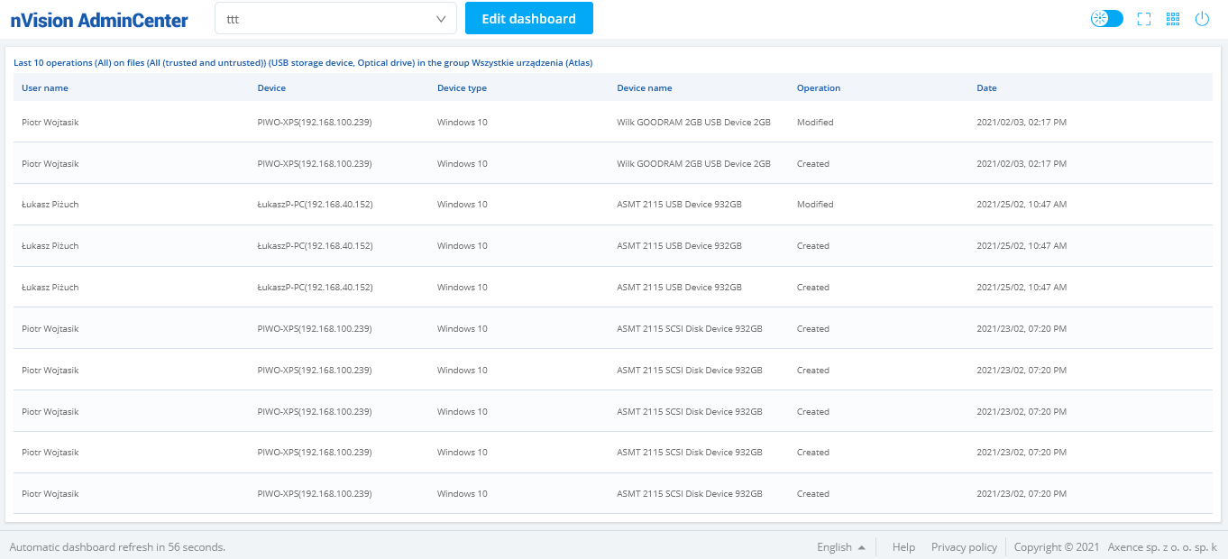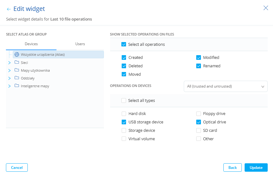Last 10 operations on files The widget lists the last 10 file operations for the selected department or map. The configuration requires the selection of the department or network map for which the events are to be shown. You can also narrow down the results by selecting the type of file operations (created, modified, deleted, moved or renamed) and type of connected device: