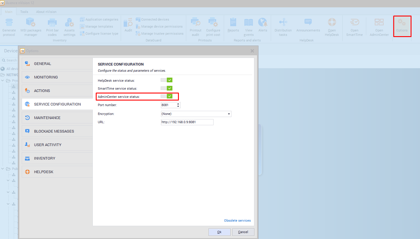 To enable AdminCenter, navigate to nVision main settings. In the Service Configuration tab, you can find the AdminCenter service status switch to enable this service: