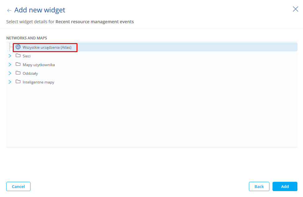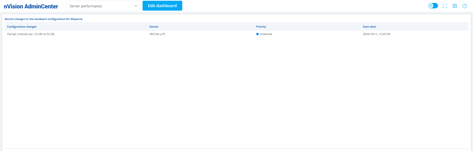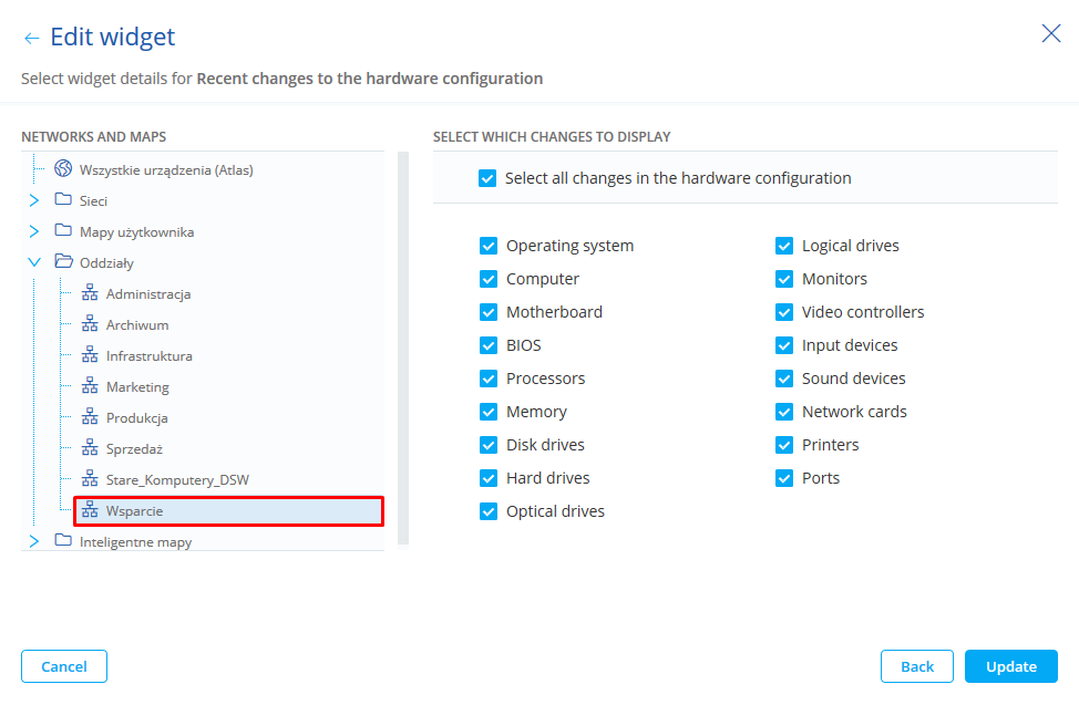 Recent changes in hardware configuration The widget makes it possible to view a table with changes in the hardware configuration for a selected group of devices. The configuration requires the selection of the map or department for which the data on changes in hard-ware configuration are to be shown. You can also define which machine components are to be included in this summary: