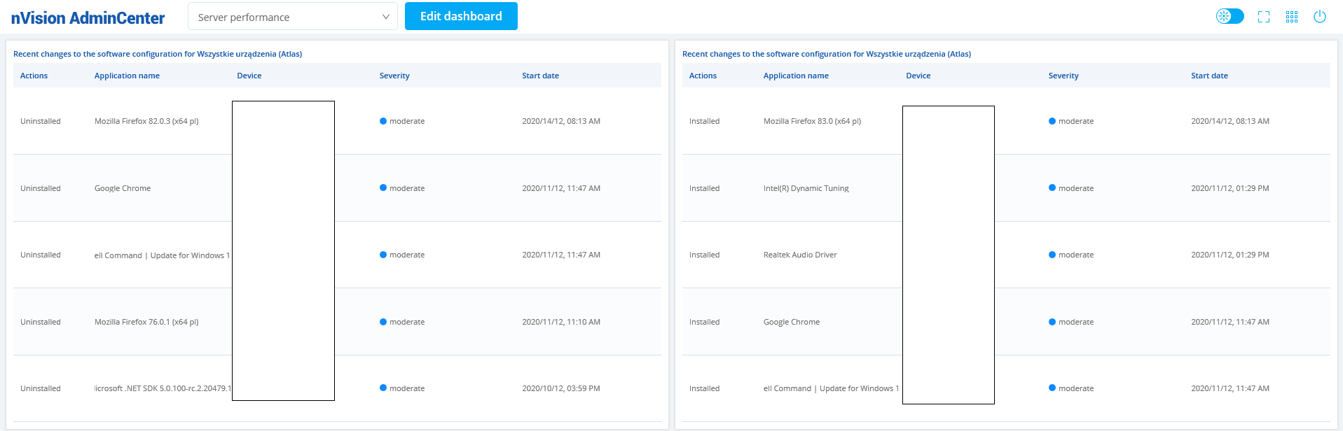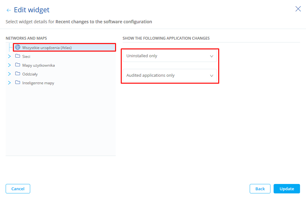 Recent changes in software configuration The widget makes it possible to view a table with changes in the software configuration for a selected group of devices. The configuration requires the selection of the map or department for which the data on changes in the configuration are to be shown. In addition, you can also define which operations are to be visible (instal-lation, uninstallation, installation or uninstallation) and indicate the type of applications to be included in the summary (audited, unaudited, all applications):