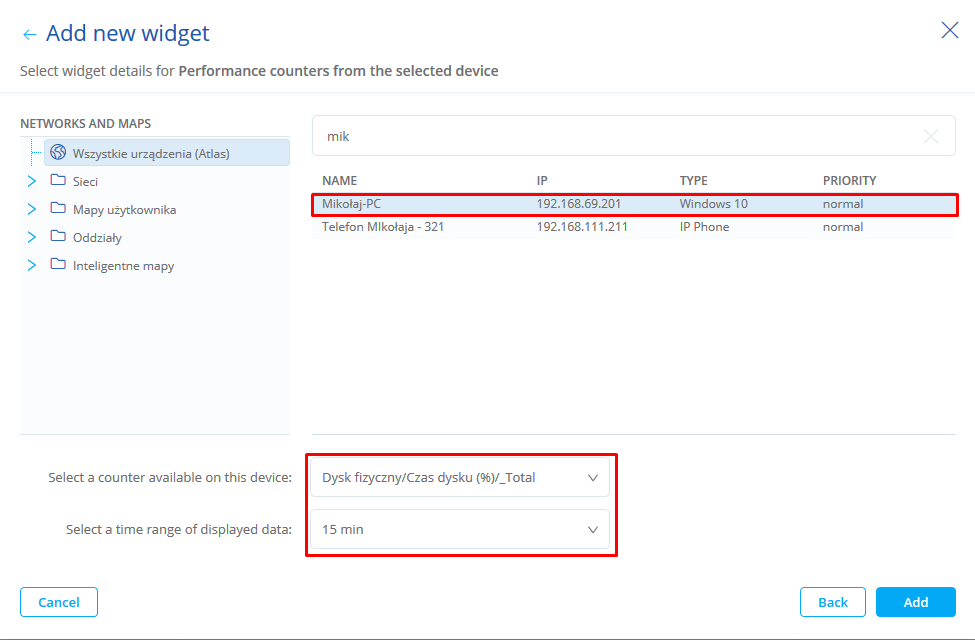 Note! To add a widget with a performance counter, the performance counter must be added to the device beforehand.