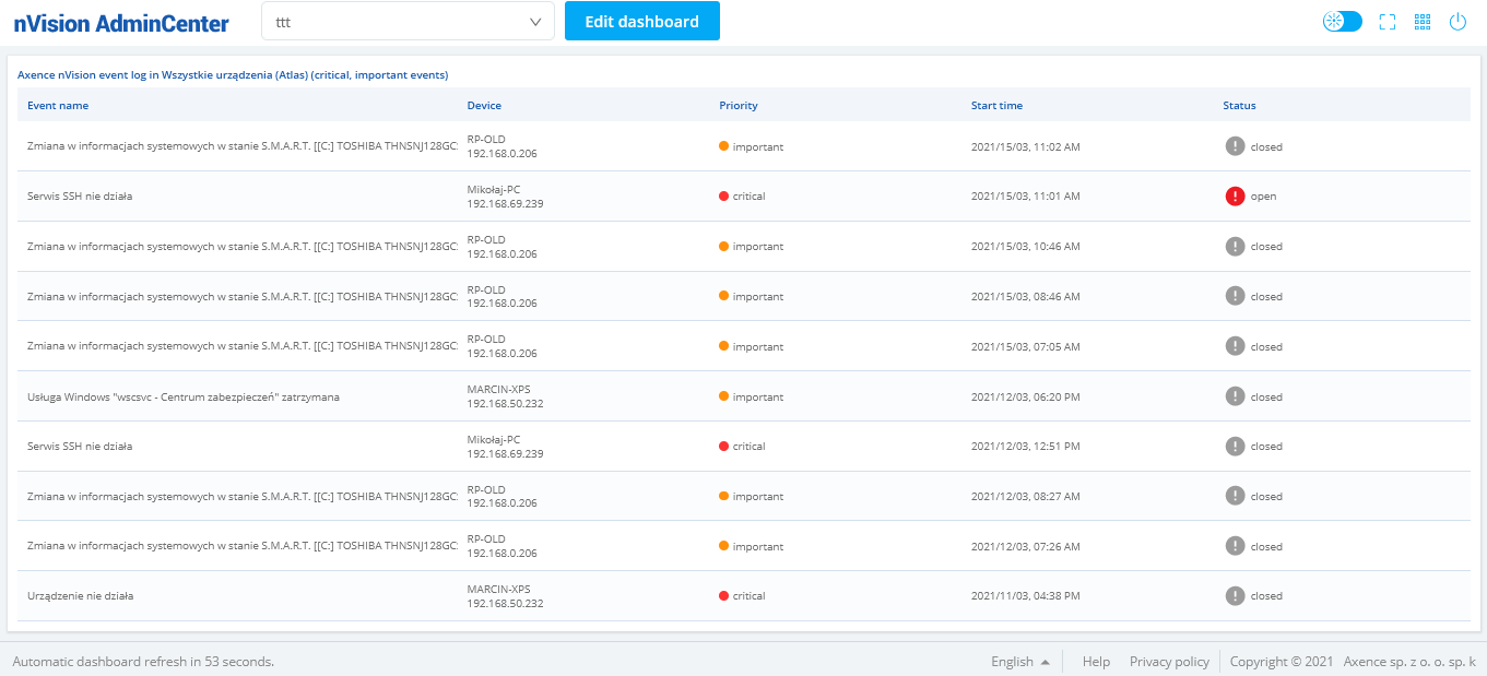 Event log (alerts) The widget makes it possible to view a table with the event log, which is also visible in the nVision con-sole. The administrator can narrow down the displayed results depending on the importance of the event: The screenshot below shows an example of the widget: