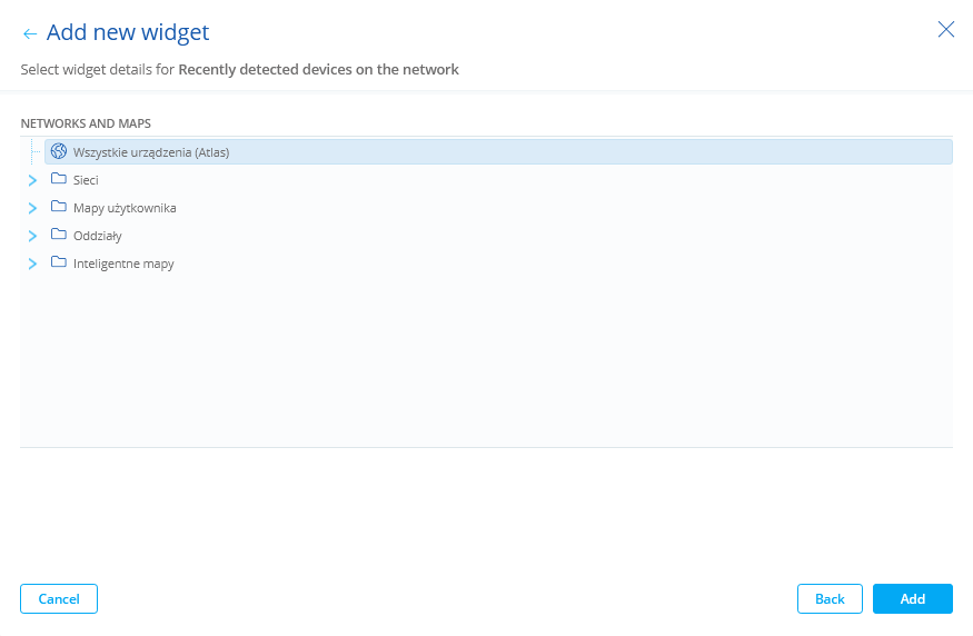 Note! To add a widget with a response time of the TCP/IP service, the service must be added to the de-vice beforehand. Recently discovered devices on the network The widget allows you to view recently discovered devices on the network. It is possible to narrow down the results to a specific network map or departament selected by the Administrator: An example of a widget is shown in the screenshot below: |