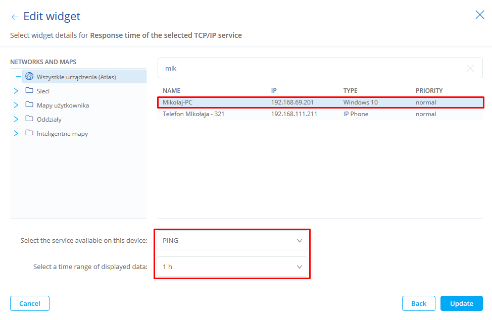 Response time of selected TCP/IP service The widget makes it possible to view a graph showing the values of responses from the selected TCP/IP service for the selected device. The configuration requires the selection of the device, the TCP/IP service and time range for the data to be shown: