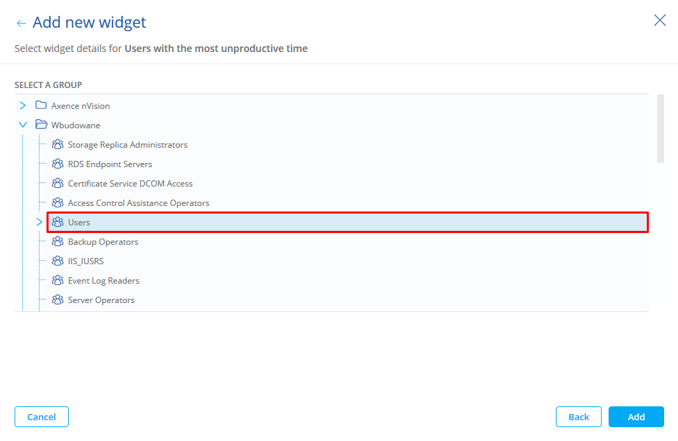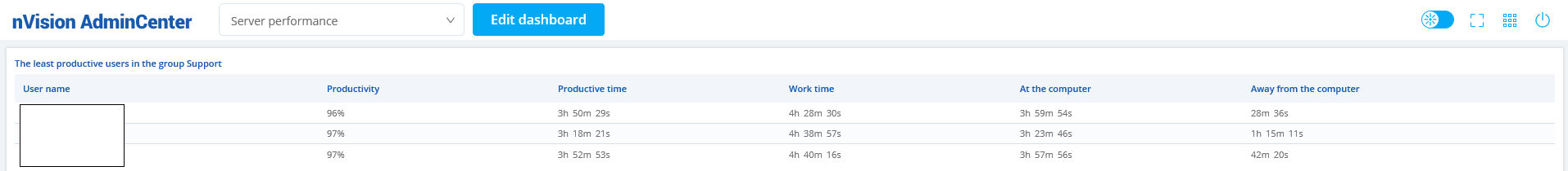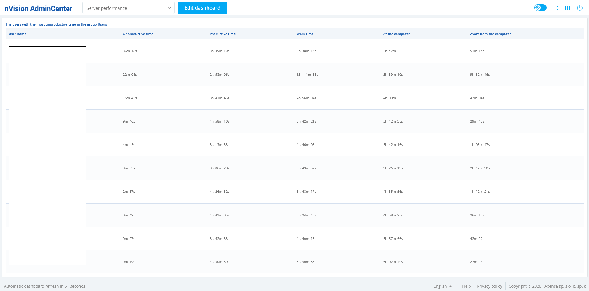 Users with longest unproductive time The widget shows the top 10 users with the longest unproductivity time in a selected group of users. The configuration requires the election of the group of users for which the data are to be shown.
