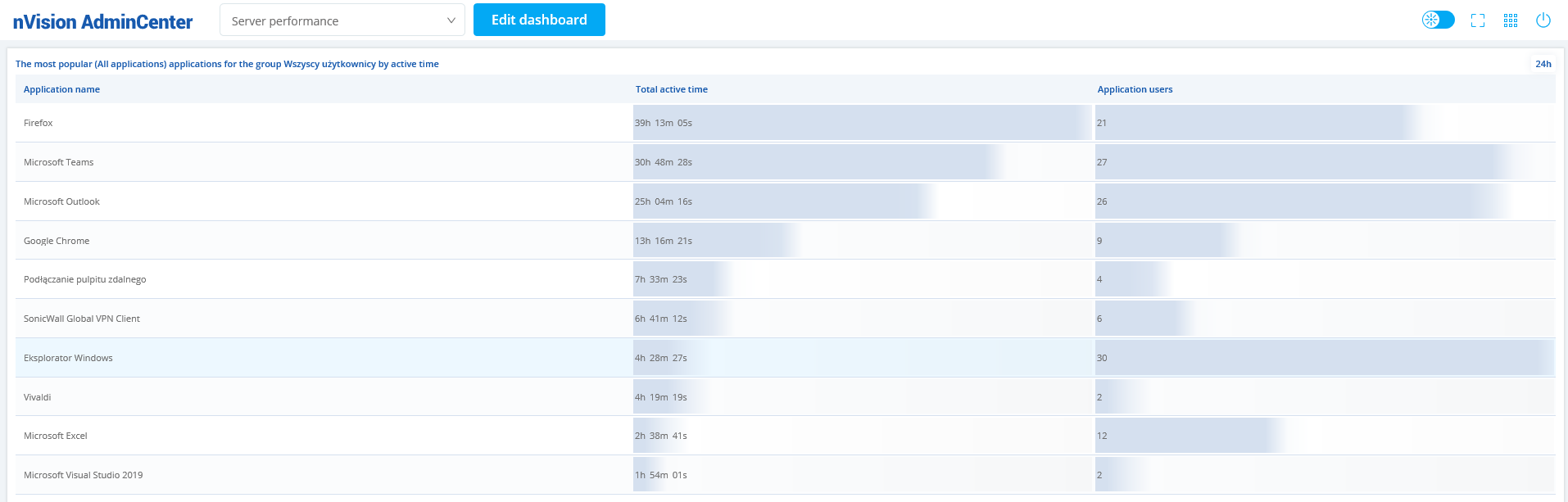 Top 10 applications with the longest activity time The widget shows the top 10 applications with the longest activity time for a selected group of users. The configuration requires the selection of the group of users and the category of applications. The categories of applications can be modified in the main nVision options using the User activity / Applications tab.