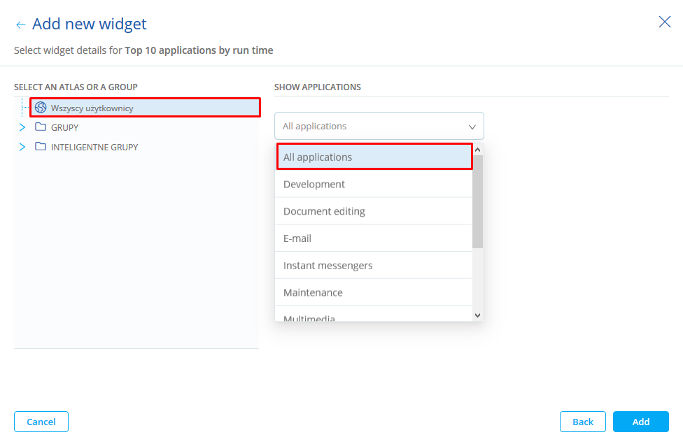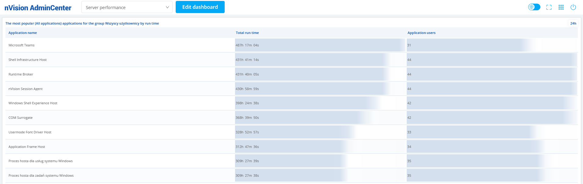 Top 10 applications with the longest run time The widget shows the top 10 applications with the longest run time for a selected group of users. The configuration requires the selection of the group of users and the category of applications. The categories of applications can be modified in the main nVision options using the User activity / Applications tab.
