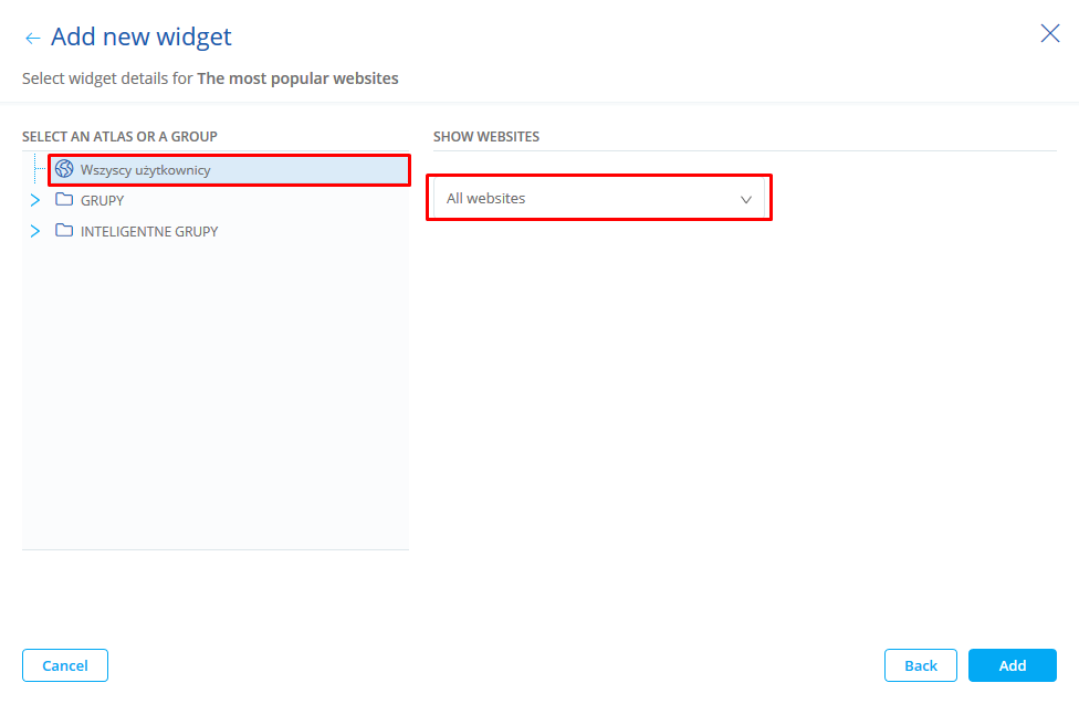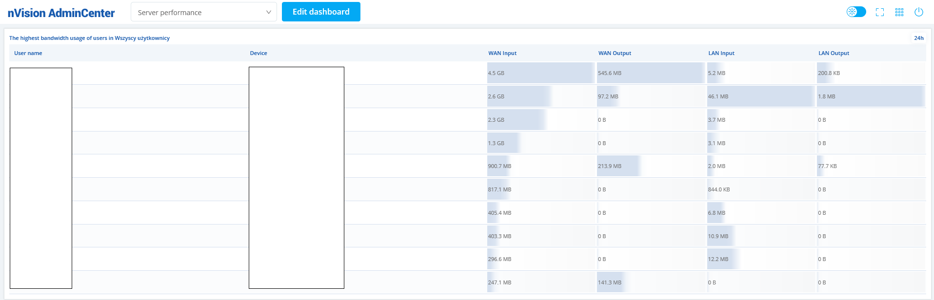 Users with highest bandwidth usage The widget shows the statistics of bandwidth usage by users in the last 24 hours. The configuration requires the selection of the group of users for which the data are to be shown and that the column by which the results are to be sorted is indicated.
