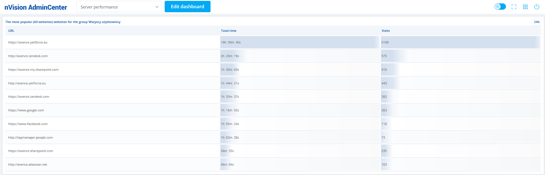 Top most visited websites The widget shows the top most visited websites for a selected group of users in the last 24 hours. The configuration requires the selection of the group of users and the category of websites. The categories of websites can be modified in the main nVision options using the User activity / Domains tab.