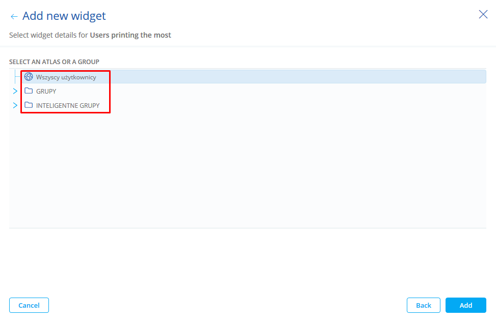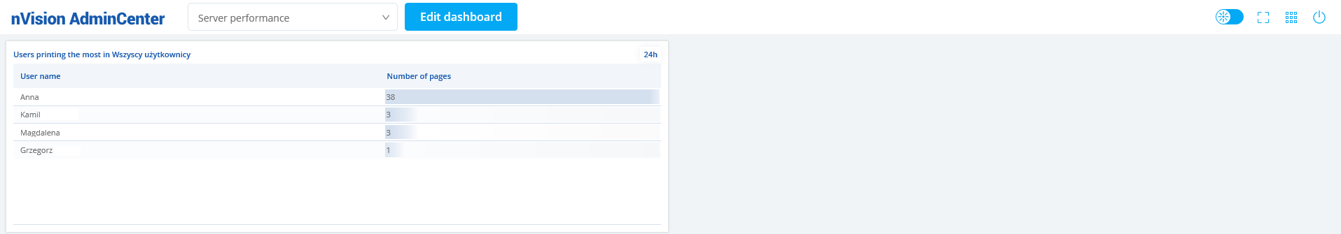 Users who print the most The widget lists the users who have made the most prints in the last 24 hours. The configuration requires the selection of the group of users for which the data are to be shown.
