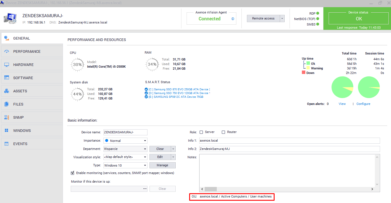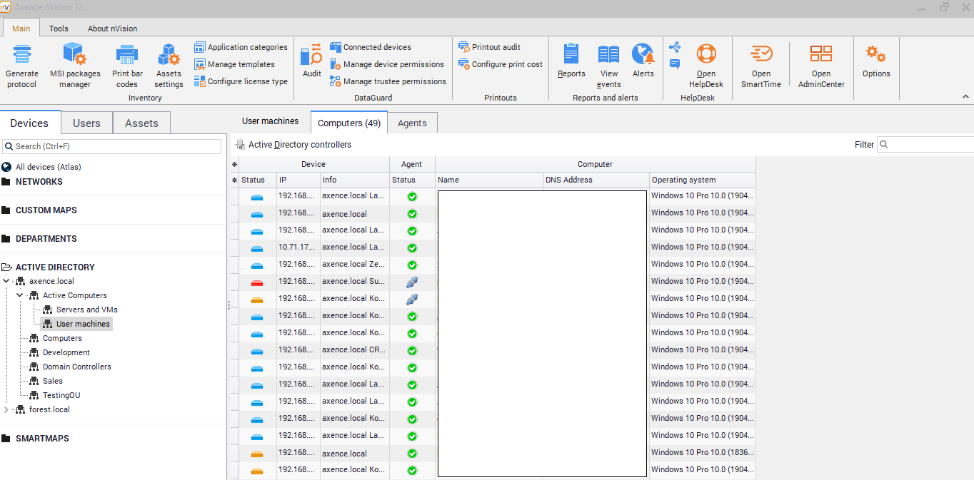nVision enables the import and synchronization of data from ActiveDirectory. The following objects can be synchronized: •Users, •Groups •Computers, •Organizational units Adding a domain controller is described in the next chapter. After successful synchronization with the domain, information about organizational units of the devices should be visible in host information window:
