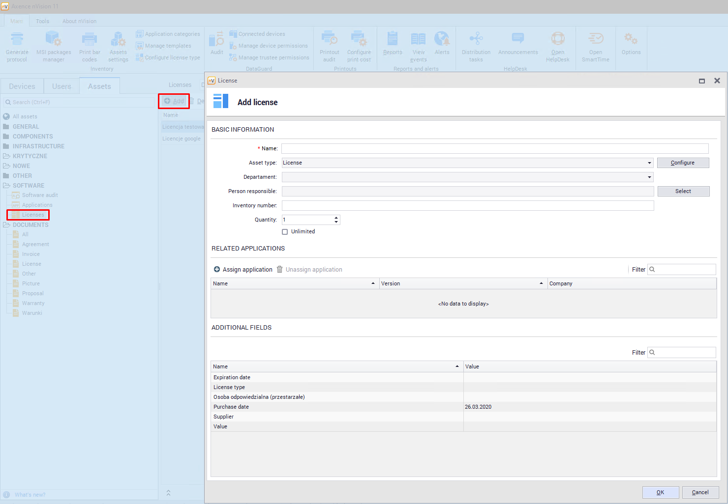 To add a new license, go to the Assets tab in the main program window and then scroll down for Licenses in the Software section. Above the license list, click the Add button. The window for adding a new license will open: