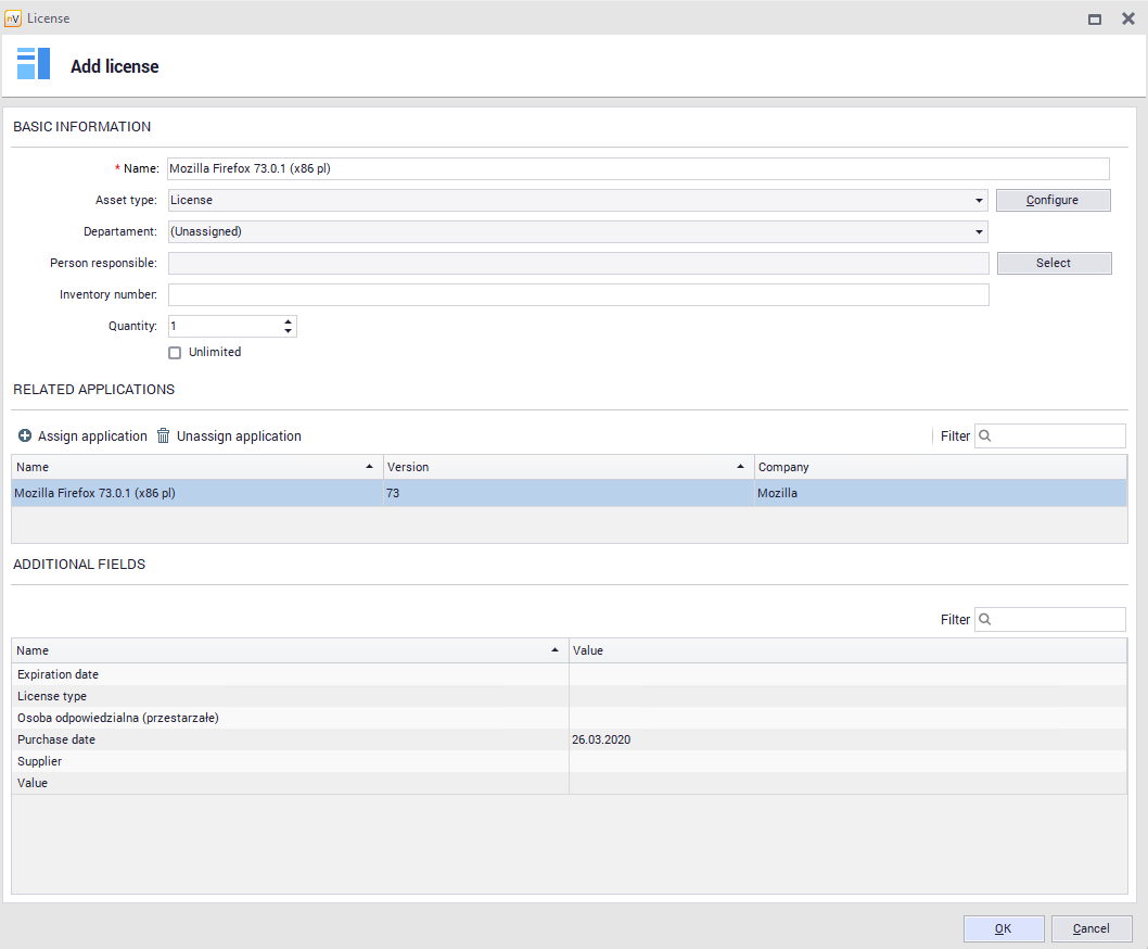 Standard description fields include: •Name, •Department (optional), •Person responsible (optional), •Inventory number (optional), •Related applications (you can only assign license to audited applications), •Quantity.