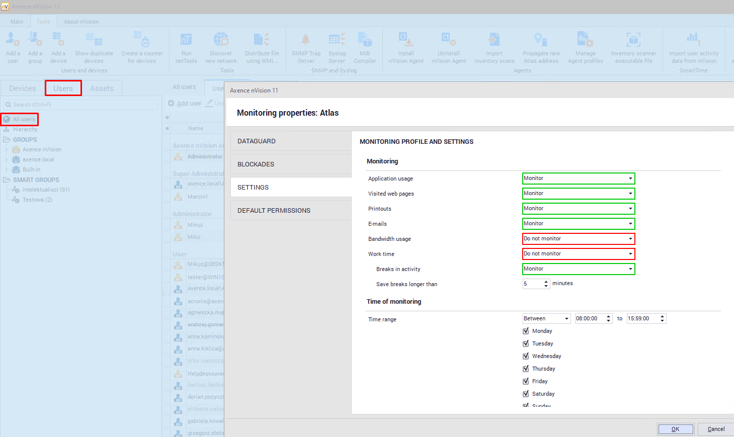 The second part of Agent configuration is Agent monitoring and visibility settings. These settings can be defined for the Atlas (all users), user groups and individuals. They can be found in different locations: 1.The Users / Atlas info / Settings window: The Group information / Settings window. 2.The Group information / Settings window. Atlas is the “general” setting, which by default is inherited by groups and users. However, this behavior can be changed for individual units by navigating to the above-mentioned setting windows.