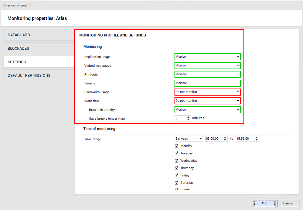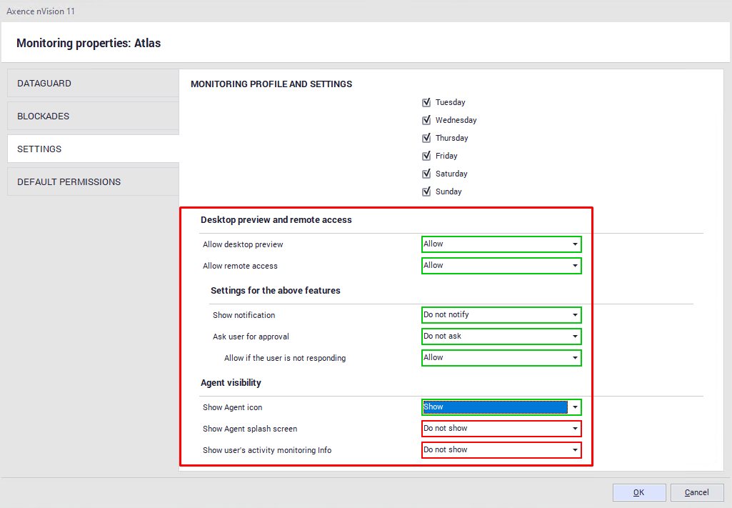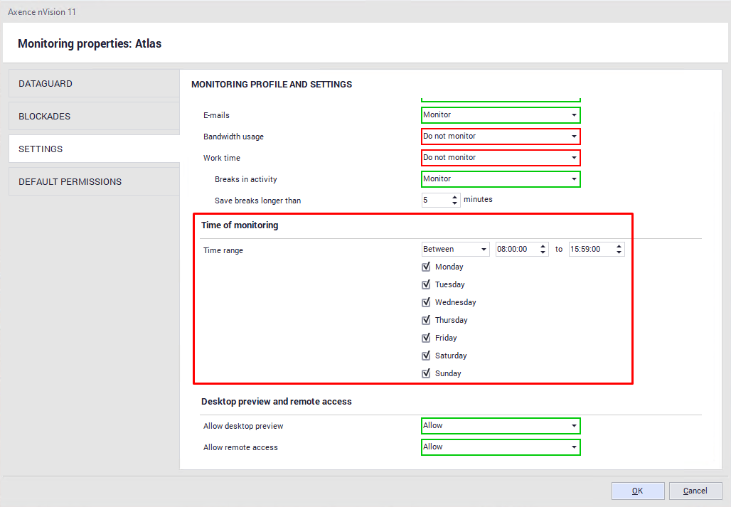 The settings include a few sections: •Monitoring The Administrator can specify what information is to be collected by the Agent. In addition, it can be determined here whether or not the breaks in activity (i.e. the time when the user does not type any characters from the keyboard or does not use the mouse) are to be monitored. Monitoring time This section defines the time periods during which the Agent should monitor the user activity. Desktop preview and remote access The settings in this section allow you to define whether or not: ▪ remote access or desktop preview is allowed, ▪ the user must agree for taking over control of their machine, ▪ the user is informed when control of their machine is taken over.