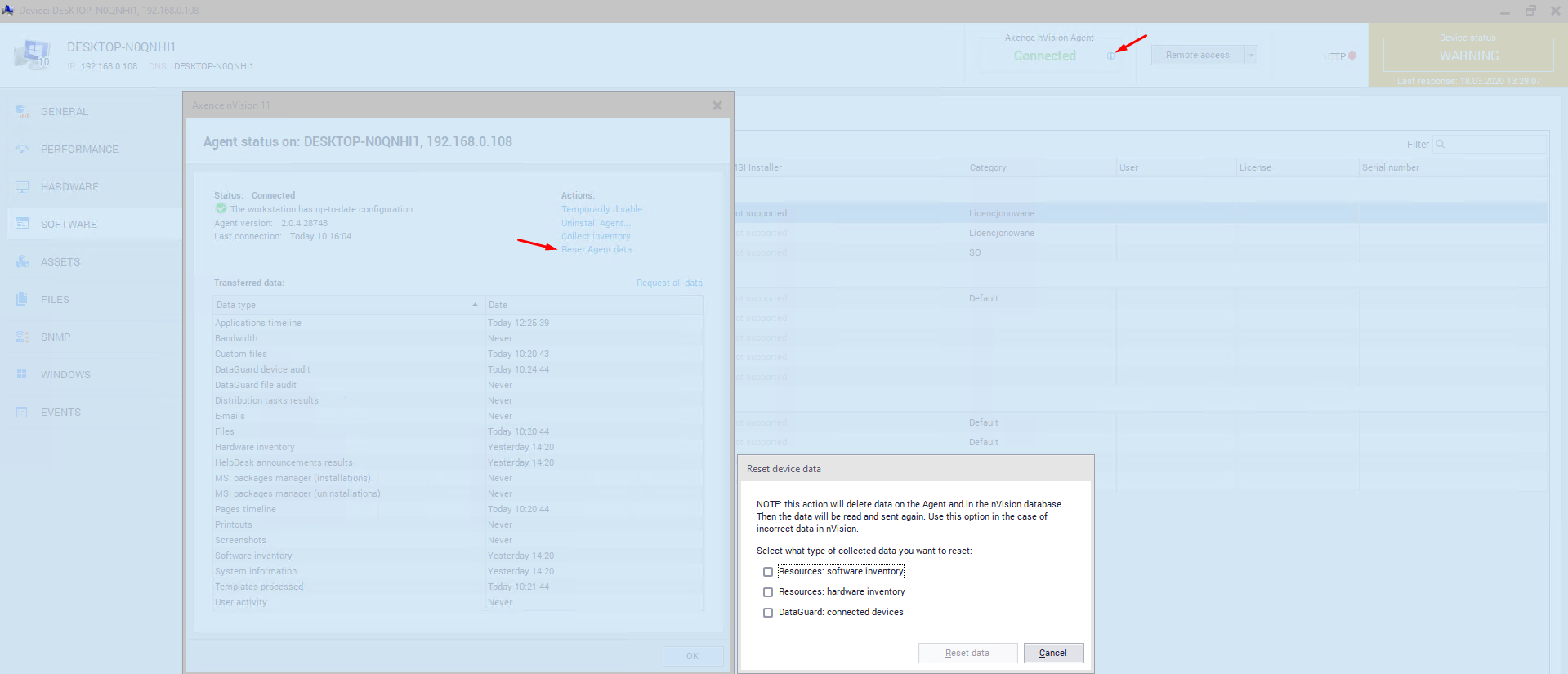 For this purpose, perform the following steps in the Host Info window: 1.Click the “i” icon in the upper part of the Host Info window. 2.In the Actions section, select Reset host data. 3.In the Reset Agent data dialog box mark the selected data types which should be reset. Click the Reset data button. Note: Checking the Force Agent on this host to reset all its data and collect it once again option will delete the data collected by the Agent from its database and from nVision database, and will restart the data collection from the moment of resetting. This option should be used only in the case of resetting hardware and software inventory data. |