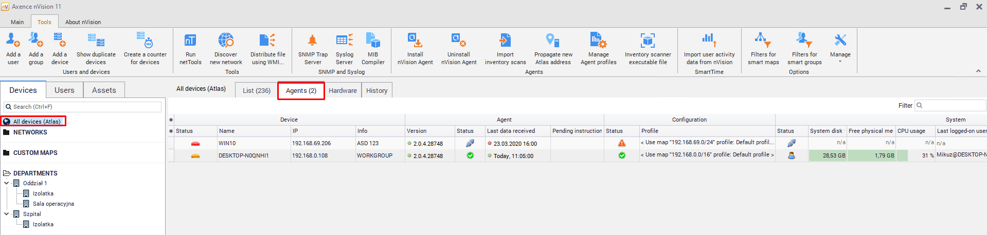 The “Agents” view in the main nVision window presents the following information: •host status, •host name, •Agent version, •Agent online (yes/no), •last connection time, •last data received, •pending instructions (Agent uninstallation, Atlas address change, host data reset), •status, •configuration, •screenshots, •free disc space, •free physical memory, •CPU usage (average for the last minute), •last logged-on user, •bandwidth data (last hour) •and other. |