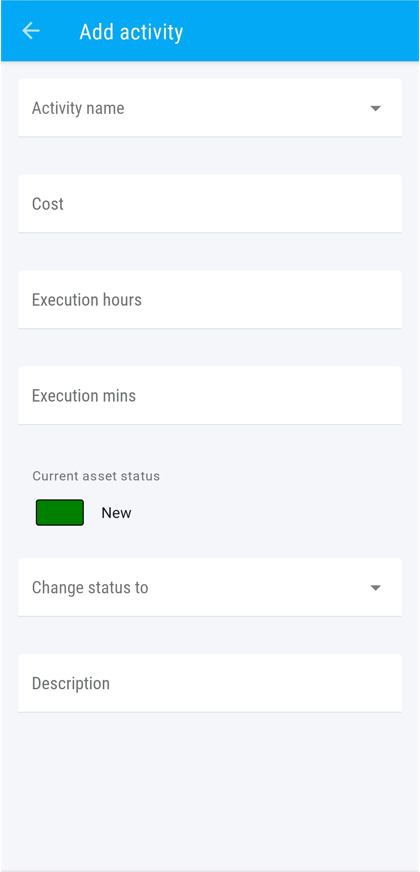 •Cost •Exeecution hours •Execution mins •Change status to (there is an information about current asset's status above it) •Description