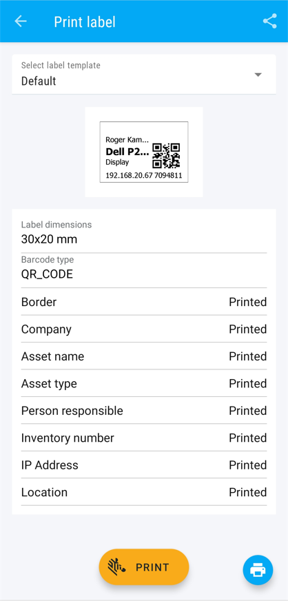 From the label printing tab, you can select a label template, share the label and select the printer you want to use. After selecting the appropriate label template, its visualization and asset parameters will be displayed below, along with information about which of them will be printed. After completing the configuration, in order to print the label, click the PRINT button.