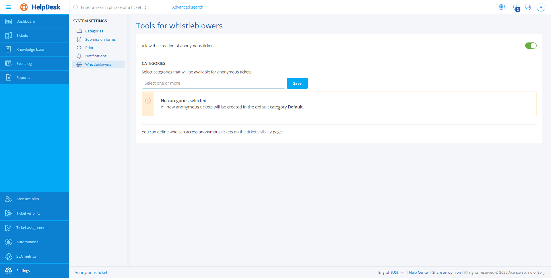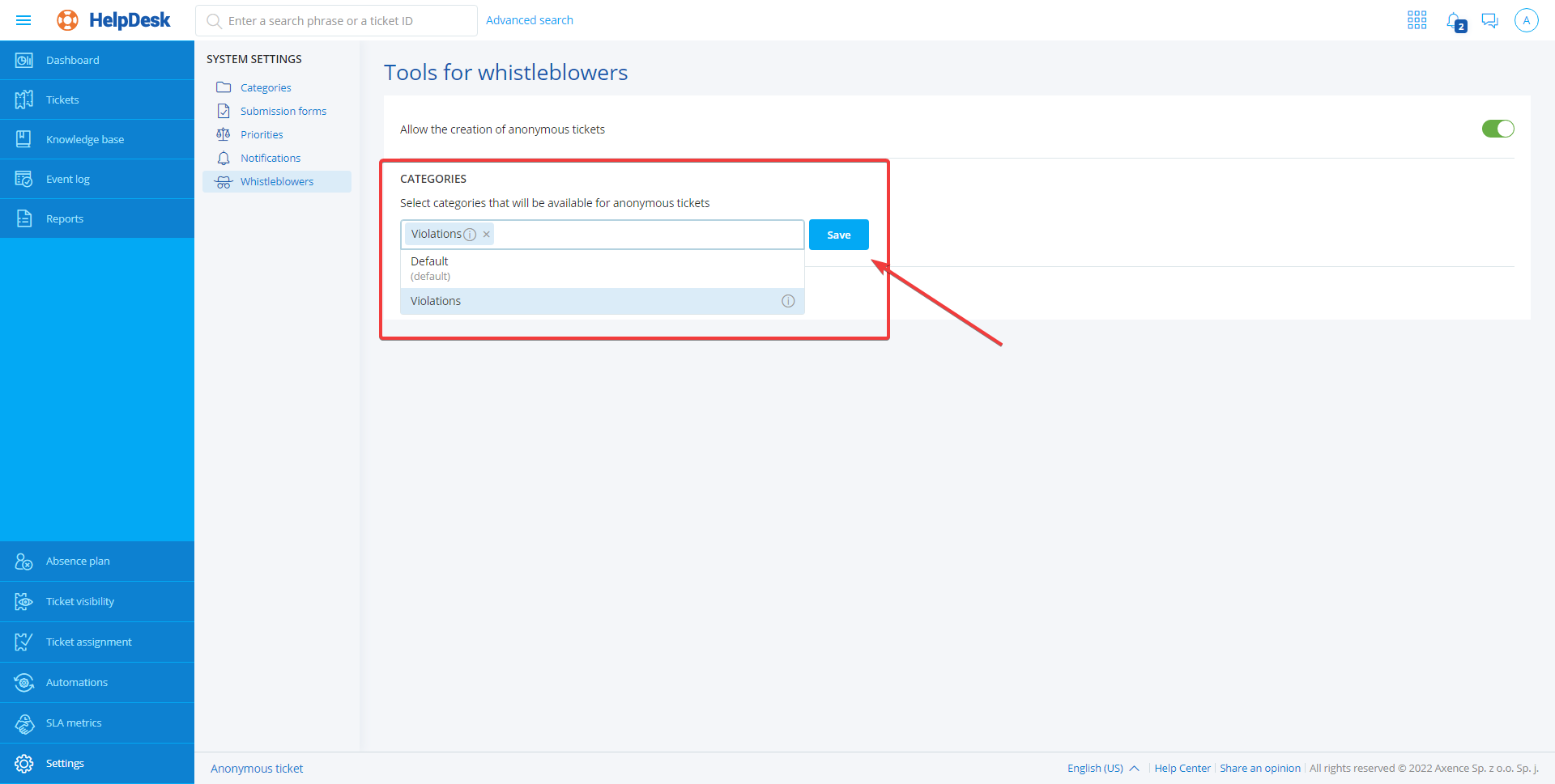 To select the categories that will be available when creating anonymous tickets, log in to the HelpDesk module as the Administrator and: 1. In the flyout menu on the left side of the window, click the Settings. 2. Enter the whistleblower settings - Whistleblowers. 3. Click the field to the left of the Save button. After clicking, a list of all categories that exist in the HelpDesk will drop down. Select the category (you can select more than one category) and confirm your selection by clicking the Save button.