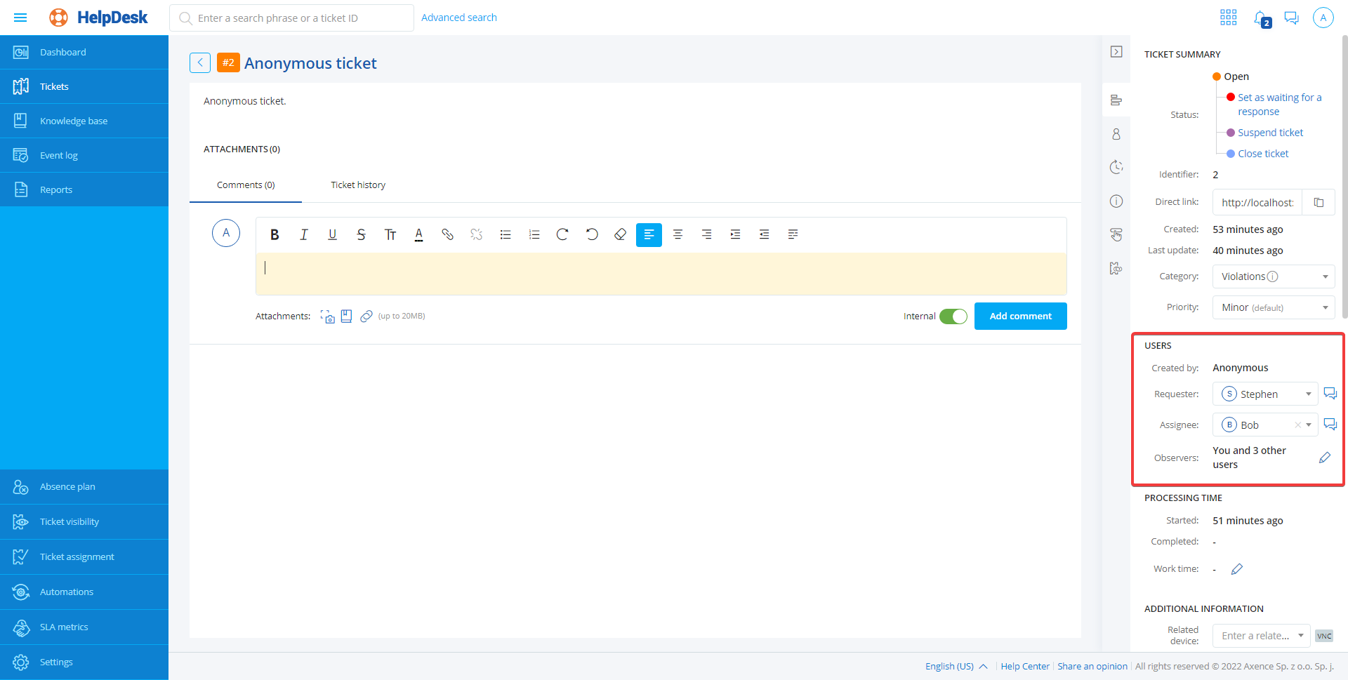 In terms of processing by the HelpDesk employees, an anonymous ticket does not differ in its form from the processing of a regular ticket. The most significant difference is that the individual reporting a specific violation does not usually have access to the ticket. This person cannot monitor the progress of work on the ticket or participate actively for instance by adding comments. However, there is an exception to this rule. In the anonymous ticket adding form, the reporter may provide their contact details. This information can then be used by the assignee to contact the reporter and grant access to the ticket, e.g. by setting him as the reporter or by adding him to the list of anonymous ticket observers.