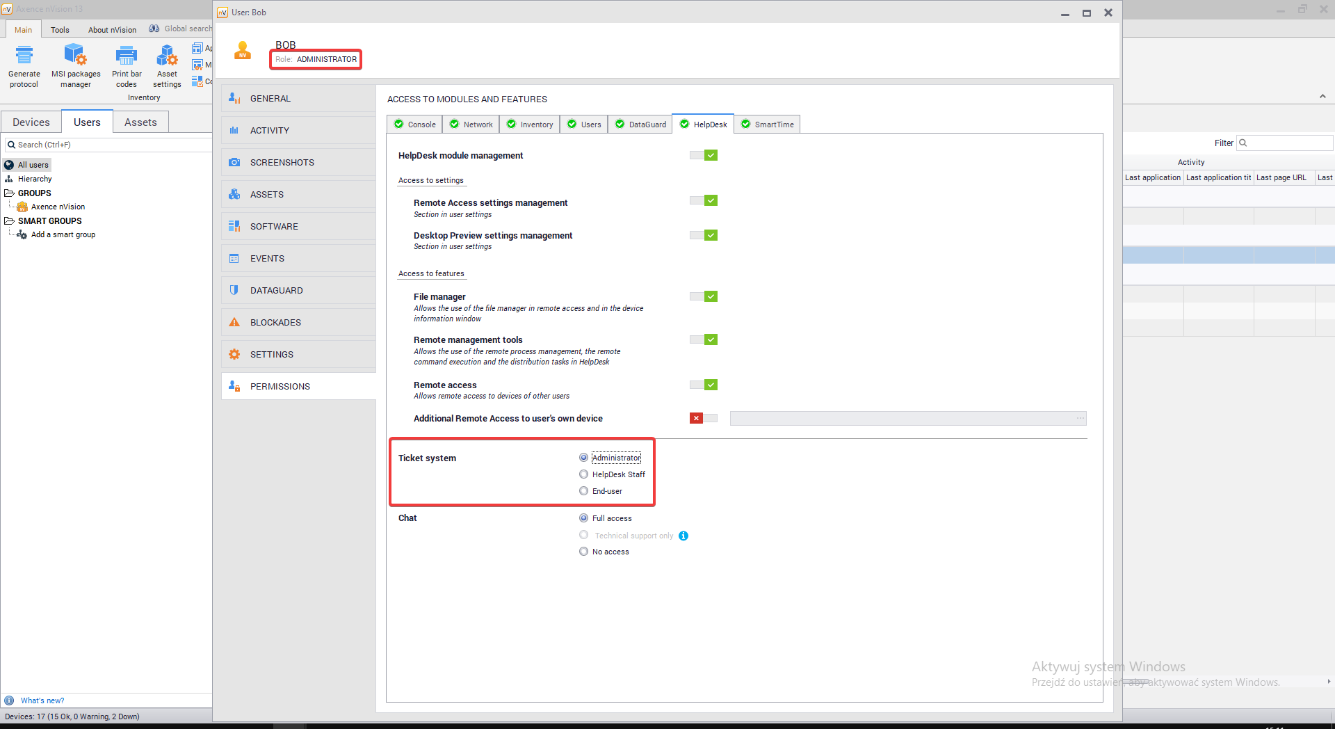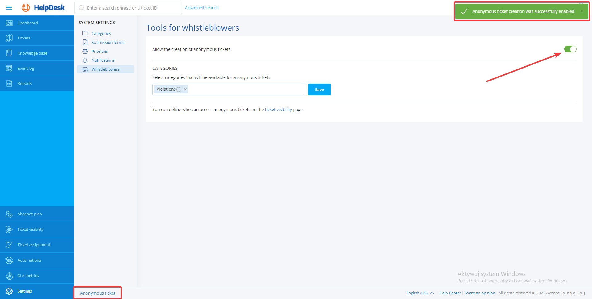 The add anonymous ticket feature in the HelpDesk is not enabled permanently - depending on the rules applicable within the specific organization or institution, it may either be enabled or disabled. The anonymous ticket settings can only be configured by the user with the Administrator role in the Ticket system (HelpDesk). To enable the Anonymous ticket feature, log in to the HelpDesk module as the Administrator and: 1. In the flyout menu on the left side of the window, click the Settings. 2. Enter the whistleblower settings - Whistleblowers. 3. Click the slider. Once you have properly completed the steps above, a message will appear in the upper right corner of the window confirming that the creation of anonymous tickets has been enabled and on the left side of the footer a link which has not been visible so far will appear, i.e. Anonymous ticket.