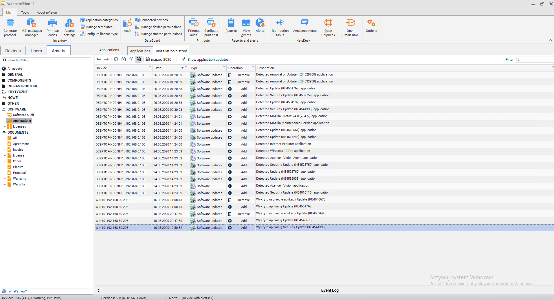 The installation history feature allows you to collect information about removed and installed applications on computers with the Agent installed. To go to the installation history, select the Assets tab in the main program window, then scroll down for Applications in the Software section. The installation history of all applications will be displayed above the application list: