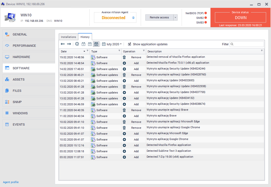 Installation history of selected host Go to the Device Information window, select Software / History tab to see the installation history of the selected host: |