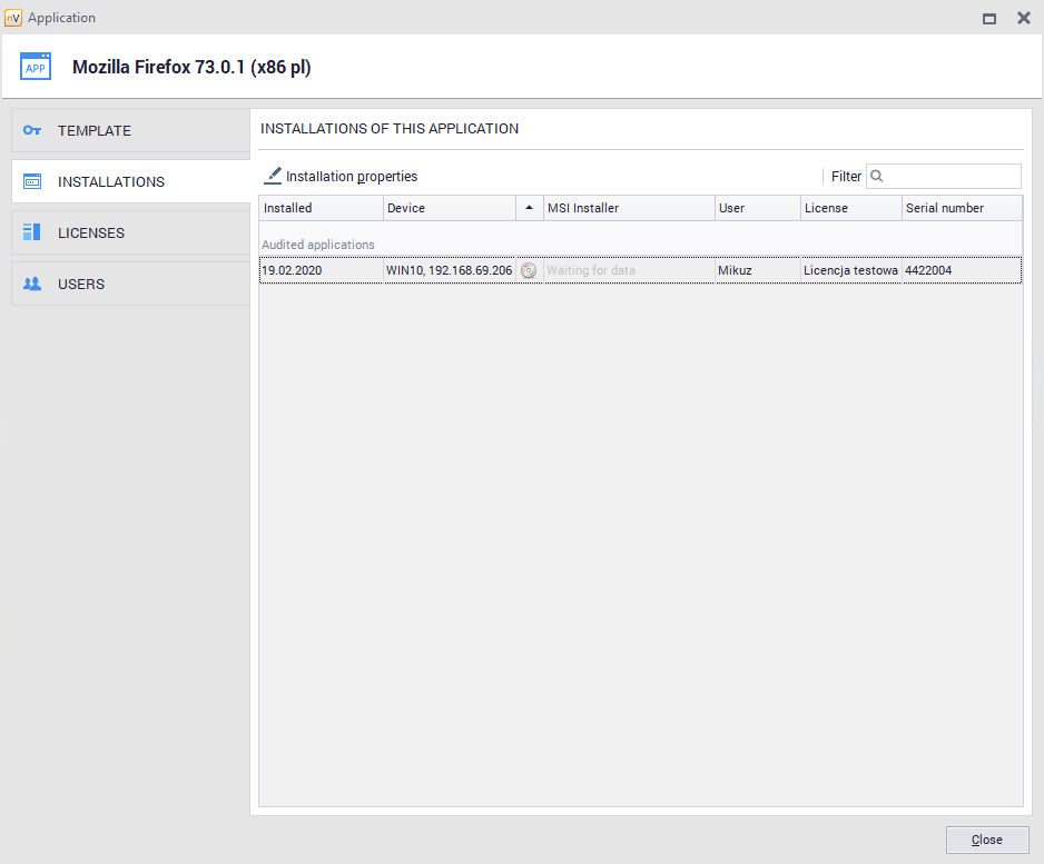 Installations are instances of applications that have been automatically detected on computers with installed Agents. You cannot manually add or remove installations. Installations can also be assigned to users and licenses. If you need to edit the application, go to the Assets tab visible in the main program window and double-click on any item on the Application list in the Software section, . The Installations tab allows you to see a list of devices on which the installation of the selected application has been detected: