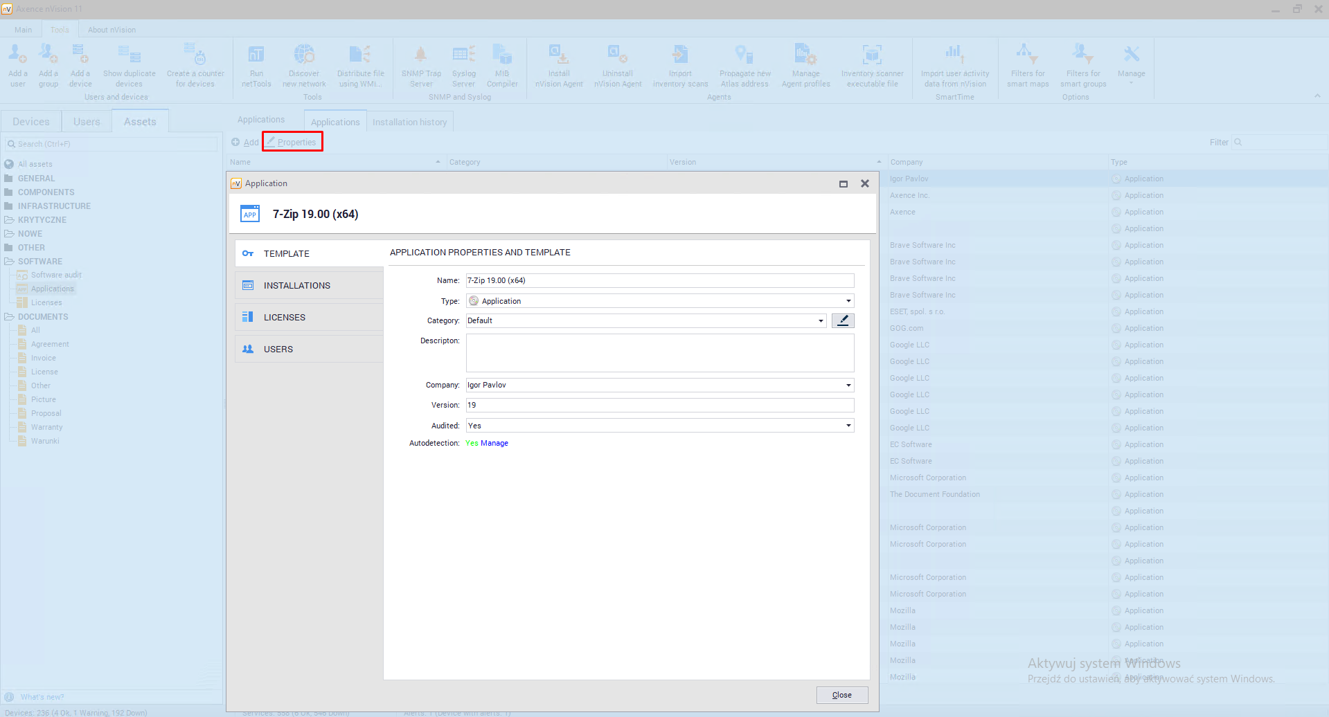 Properties window will be opened. The individual elements shown here are described in the following chapters. An important parameter of the application is the "Audited" field - if the application is audited, it is possible to assign a license to it. |