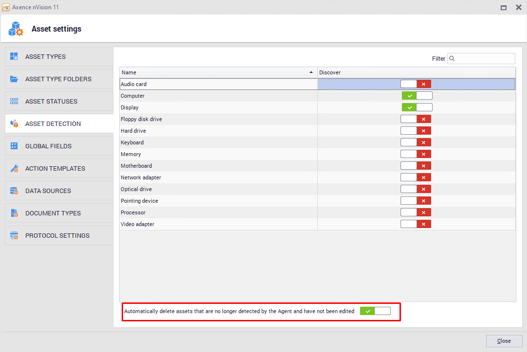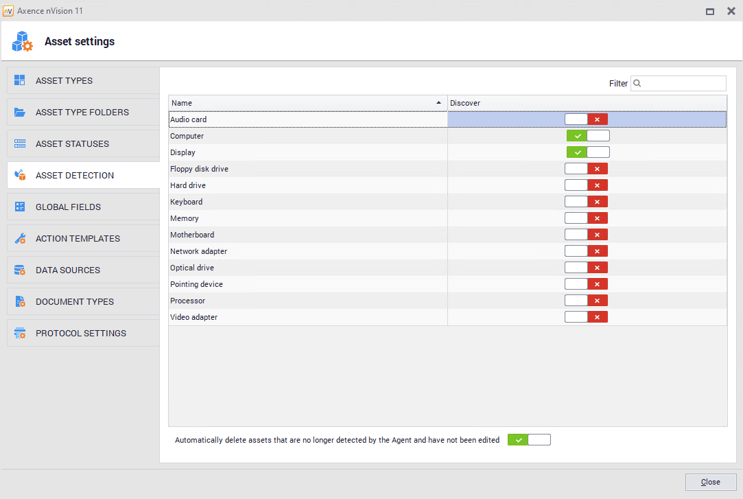 By default, "Computer" and "Display" assets are automatically detected. To enable automatic detection for the selected type simply switch the button in the discover column by the selected position. Automatic asset removal For automatic asset removal simply click the switch placed at the bottom of the asset discovery tab: