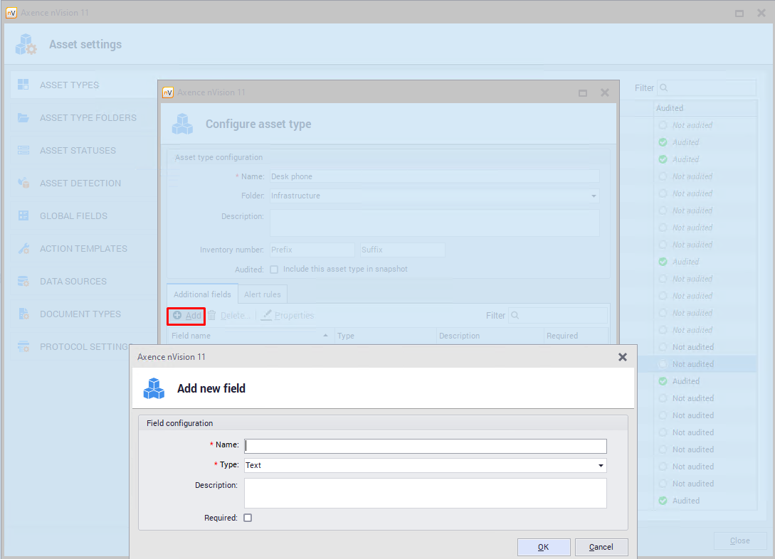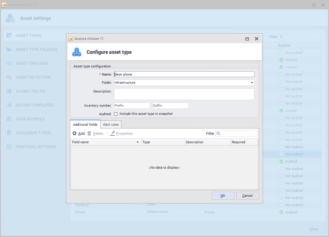 By double-clicking the asset type in the table, you can view its properties. Alternatively, you can use the Properties button. Properties window presents the properties of the selected item together with Additional fields and Alert rules tabs.