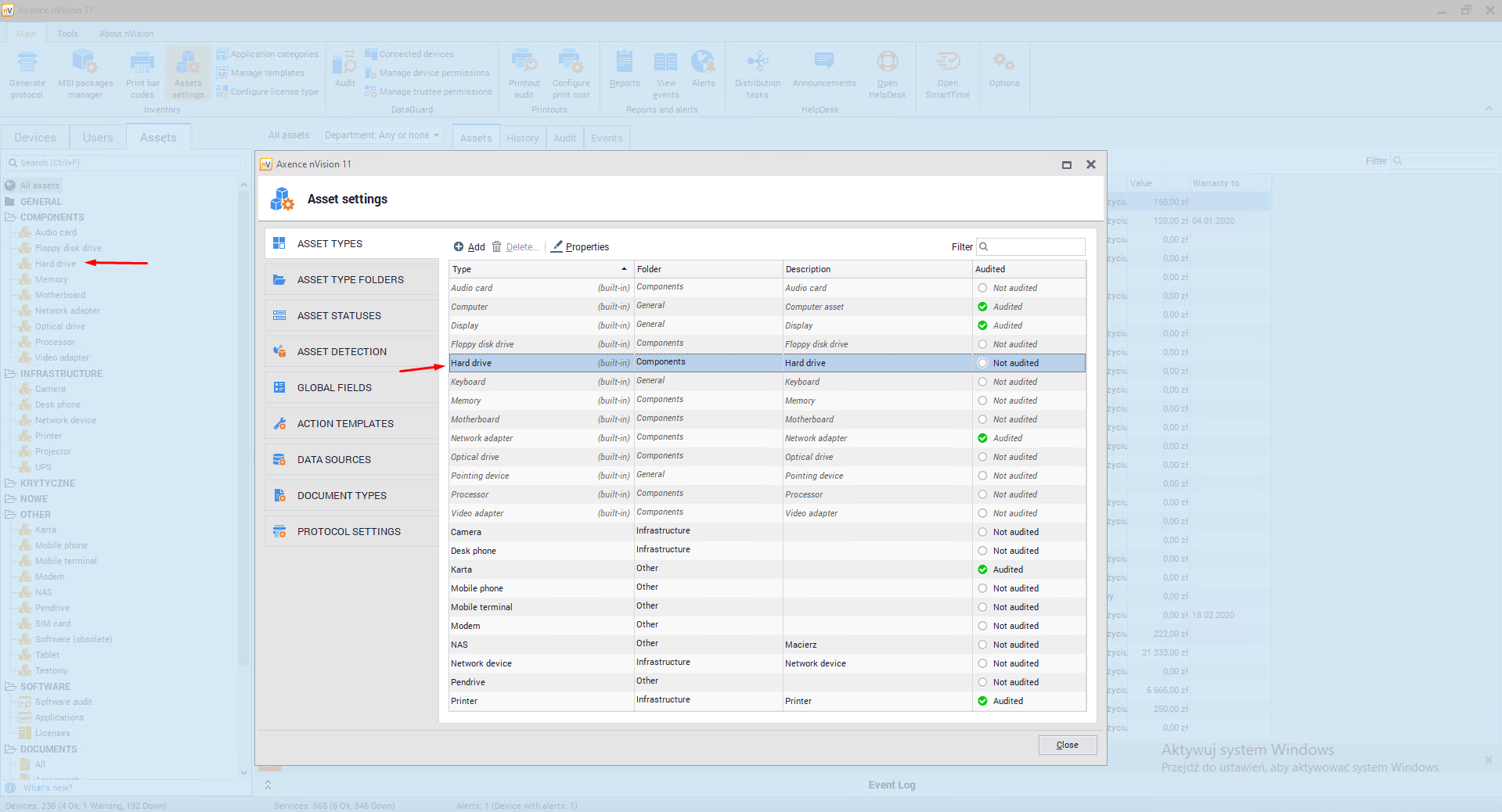 Each asset type has the following properties: •Name - type name, •Folder - folder where type is stored •Inventory number - sets prefix and suffix for selected type •Audited - mark to set, if the assets of particular type should be stored in audit archive