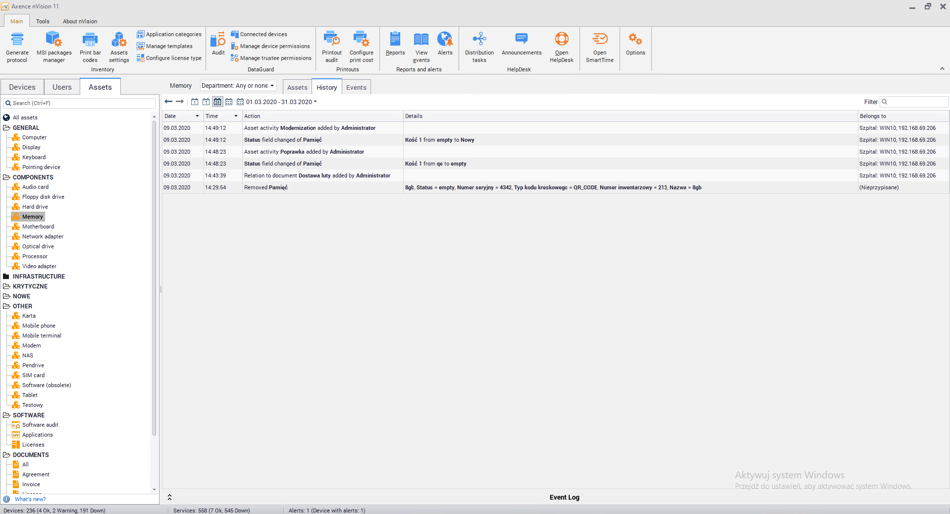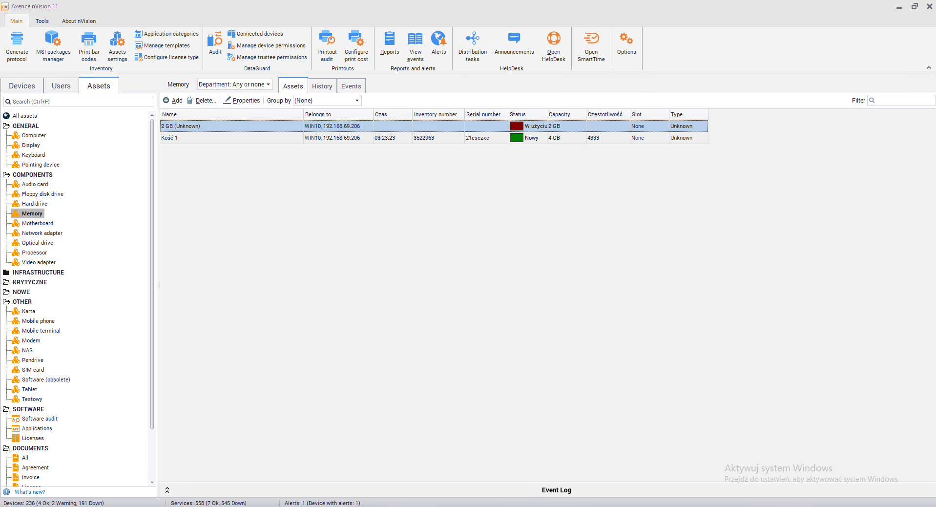 Assets There are several ways to present resource data. Click on all assets to display a list of all collected assets. By selecting an asset type from the list, a list of all assets of this type of asset will be displayed. The table presenting data on a given type of resource will also contain data from additional and global fields, but only if a value has been entered. The following screenshot presents the table for the "Memory" type with the "Frequency" as additional field and the "Time" as global field: You can filter the list, edit the asset, delete it or add a new asset by using the buttons at the top of the window. The process of adding a new resource is described in a separate chapter. A few additional tabs are visible above the asset table. They include: •History Shows the history of operations performed on the selected asset type. See history chapter for more information about data stored in History. •Events Events were described in dedicated chapter.
