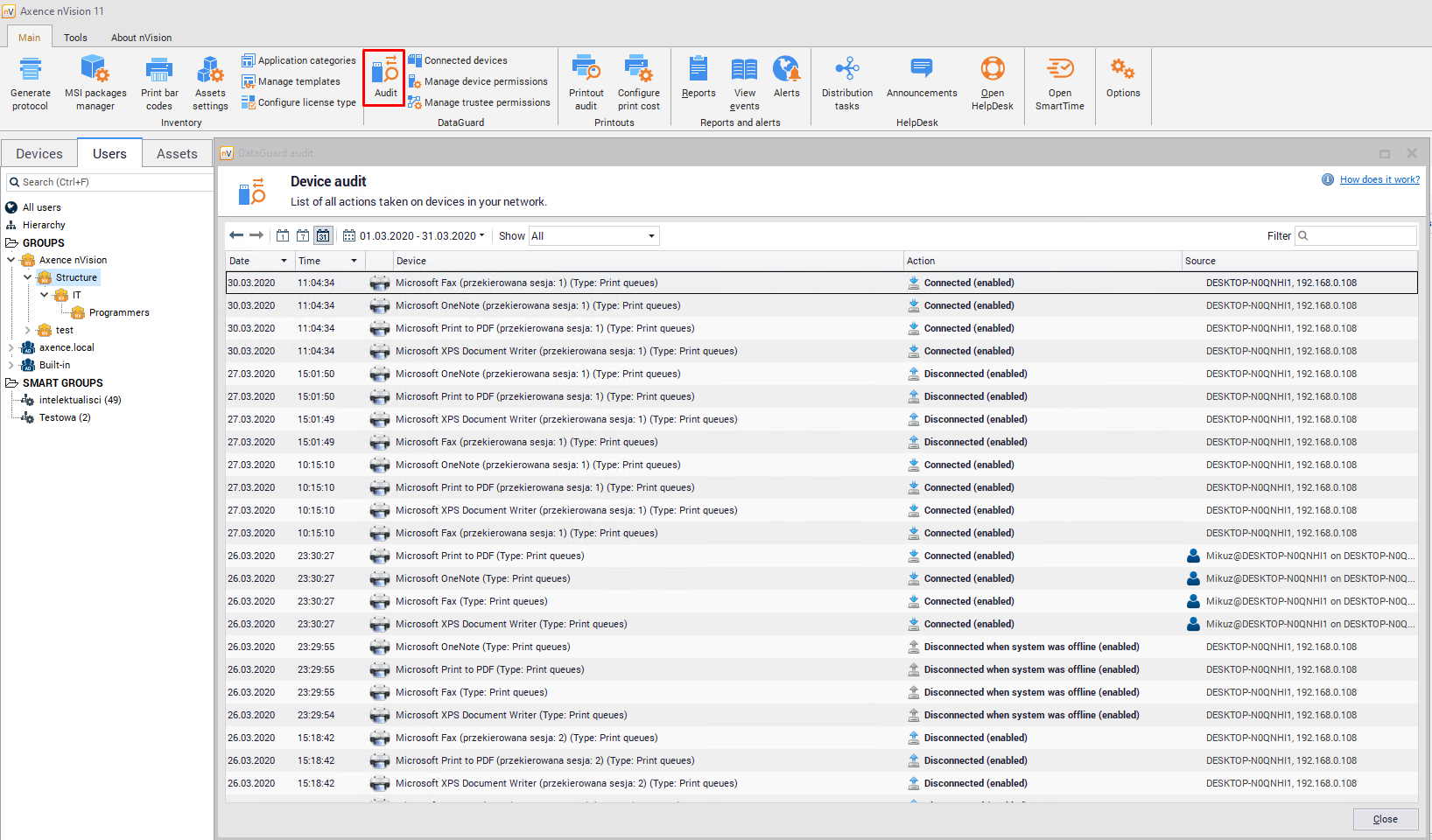 To perform a device audit: 1.Select the Audit option in the main toolbar in the DataGuard section. 2.Choose a period of information to be viewed. Reviewing device access history can be also performed from the level of the Manage trustees window. To learn more, see section Access log. |