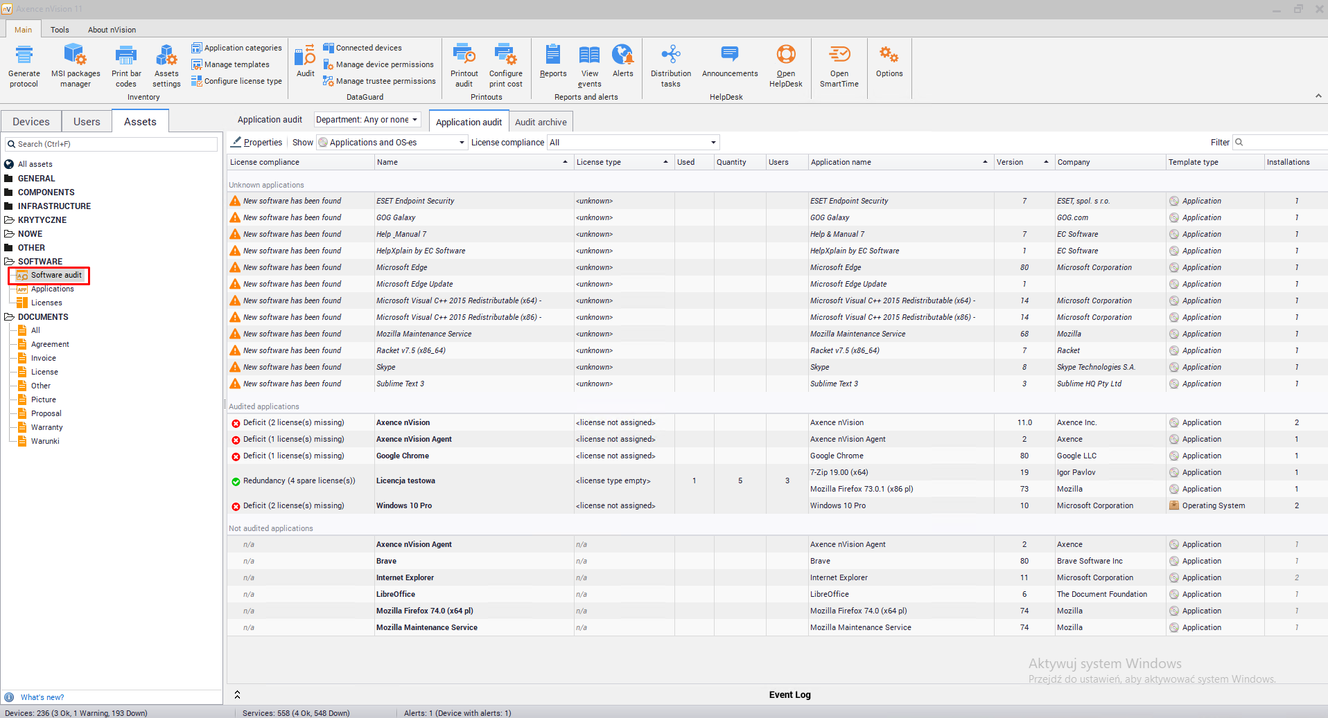 The Software Inventory Audit window contains a list of applications detected on the monitored computers. If the programs are recognized, the type of license and the number of licenses held appears in comparison with the number of licenses used (Installations column), i.e. the number of workstations on which a given application is installed and associated with a given license.