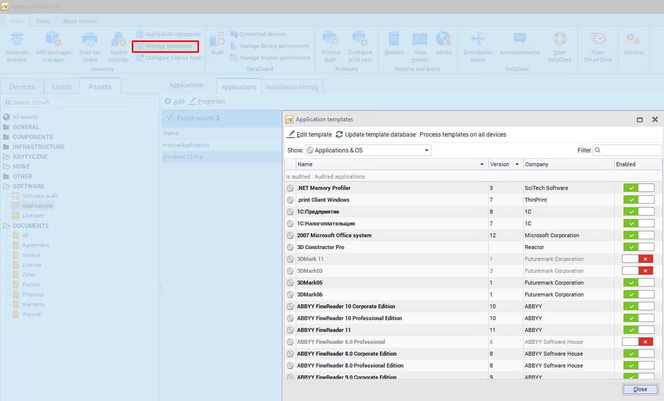Patterns visible on the list have been synchronized with the Axence database and only the category to which they belong can be modified. Administrator has the ability to disable selected items using the context menu or by switch located on the right side of the window. Patterns database update Click Update template database button and nVision will download the latest available templates from the Axence server and add them to nVision. |