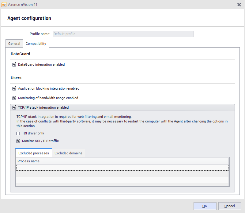 Monitoring e-mails and blocking websites is only possible for machines with the installed Agent and enabled integration with the TCP/IP stack. To learn more on Agent installation, see the Installing and uninstalling Agents section. The following protocols are supported at the moment: HTTP, HTTPS, SMTP:25, SMTP:587, SMTP via SSL, POP3 via SSL and POP3:110. The following protocols are not supported at the moment: IMAP, MAPI. Enable integration with TCP/IP stack If the Agent is installed, the reason for the problems with monitoring e-mails and blocking websites may be a disabled integration with the TCP/IP stack. By default, this integration is disabled due to the necessity of earlier tests, mostly in the scope of cooperation with anti-virus software. To enable TCP/IP stack integration: 1.Select the Managing Agent profiles option in the menu bar (in the Tools and options page). 2.Create a new profile or select the profile used by Agents, and then click the 3.In the profile configuration, check the Turn on TCP/IP stack integration option in the Compatibility tab.