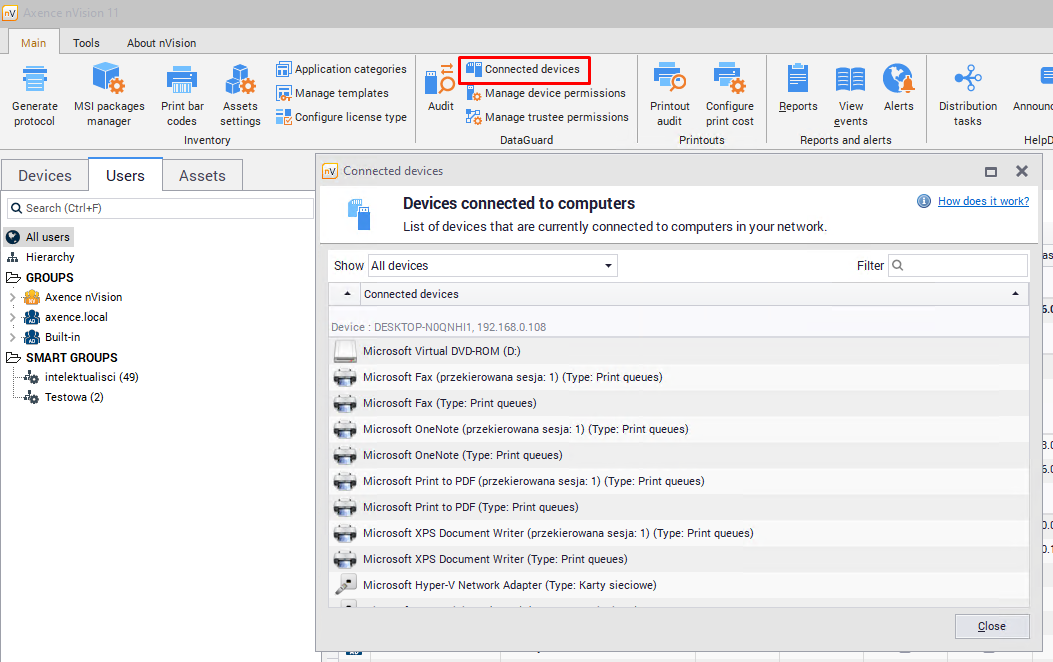 It is also possible to view devices connected to a given computer from the level of the Host info window specific for a given computer (Inventory / Hardware / Connected devices tab). The most general view with the option to switch between workstations, maps and different functionalities of the DataGuard module is offered by the Manage trustees window. To learn more, see section Managing trustees. |