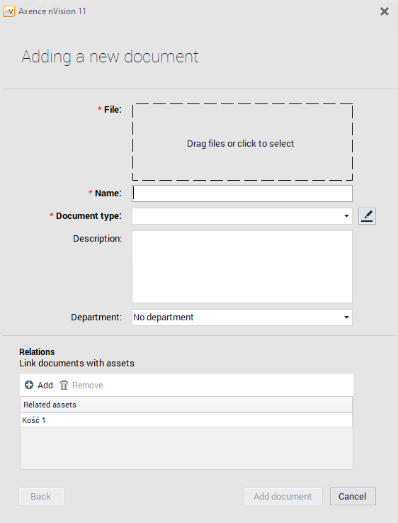 Document information The required fields are marked with ' * '. •File - select or drag a file to the selected place, •Name - the name of the document visible in nVision, •Document type - select one item from the list - adding new document types is described document categories chapter •Description - additional text fields describing the document, •Chapter - additional field to specify a branch.