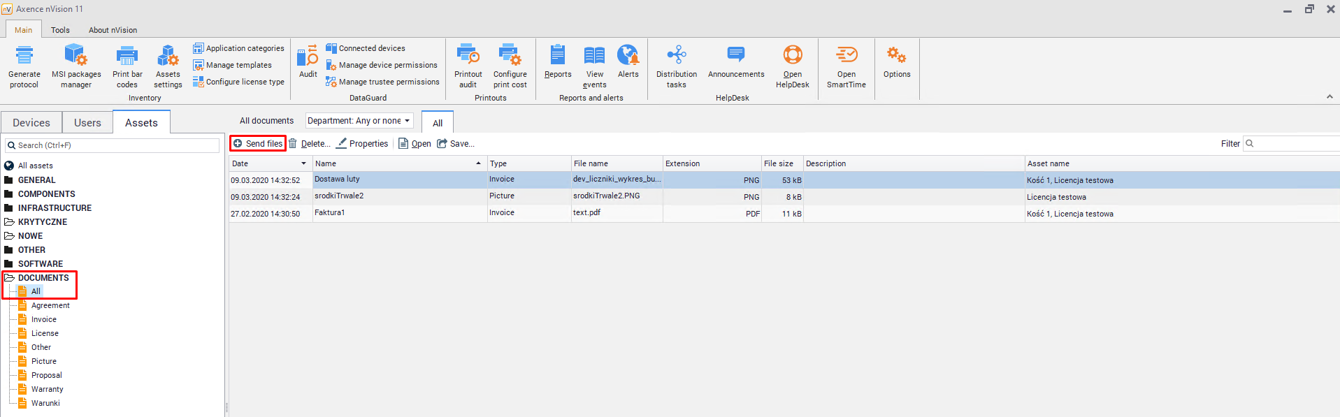Alternative process for adding documents You can also add Documents by using the "Assets" tab displayed in the main nVision window. At the bottom of the list in the documents section, click first the document type then the Send files button located at top window pane. A window for adding a new document will be opened: