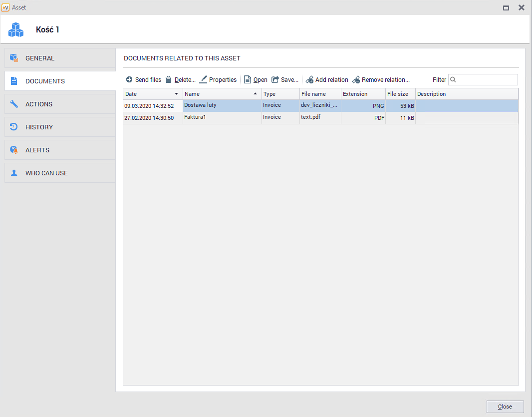 The Documents tab allows you to add, display and delete documents related to the selected asset. The documents associated with the selected asset will be visible in the table: