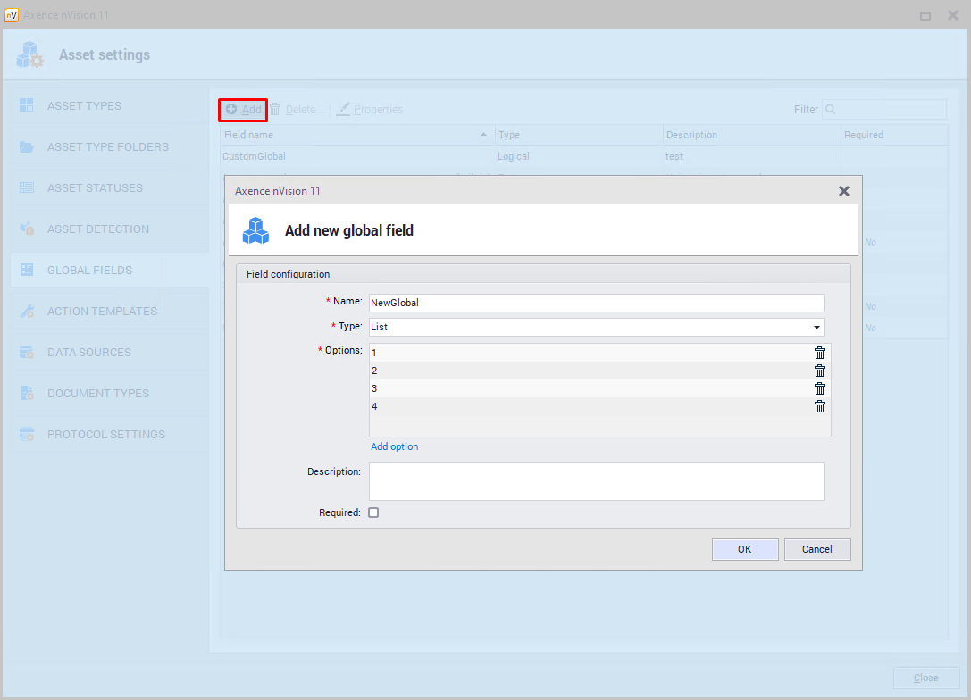 Adding global field To add a global field, go to the Asset settings / Global fields window and click Add. The new global field configuration window will open: