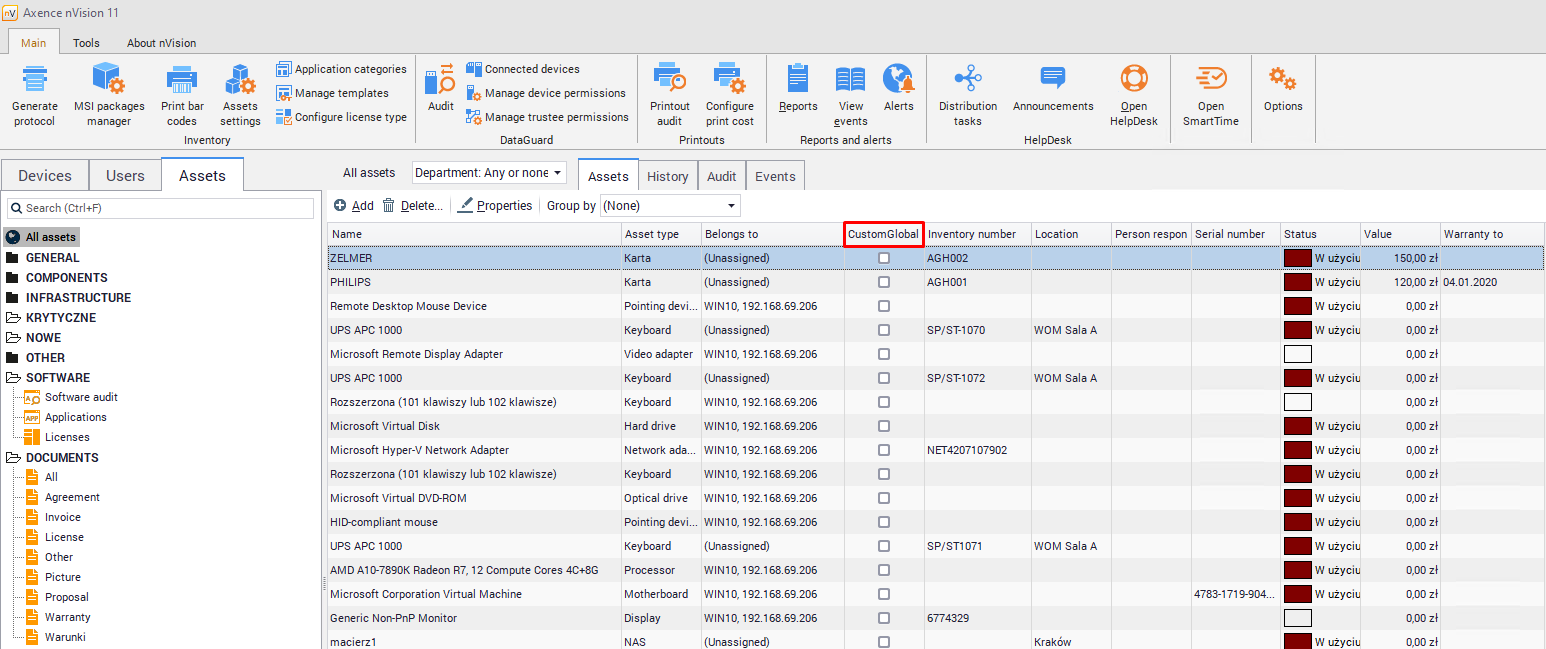 Global fields allow you to add additional information about the resource and extend the possibilities of selecting assets from the list. For example: after adding the 'CustomGlobal' global field, an additional column will be created with the value set to this field. By clicking the filter icon in this column you can filter lists in every column: