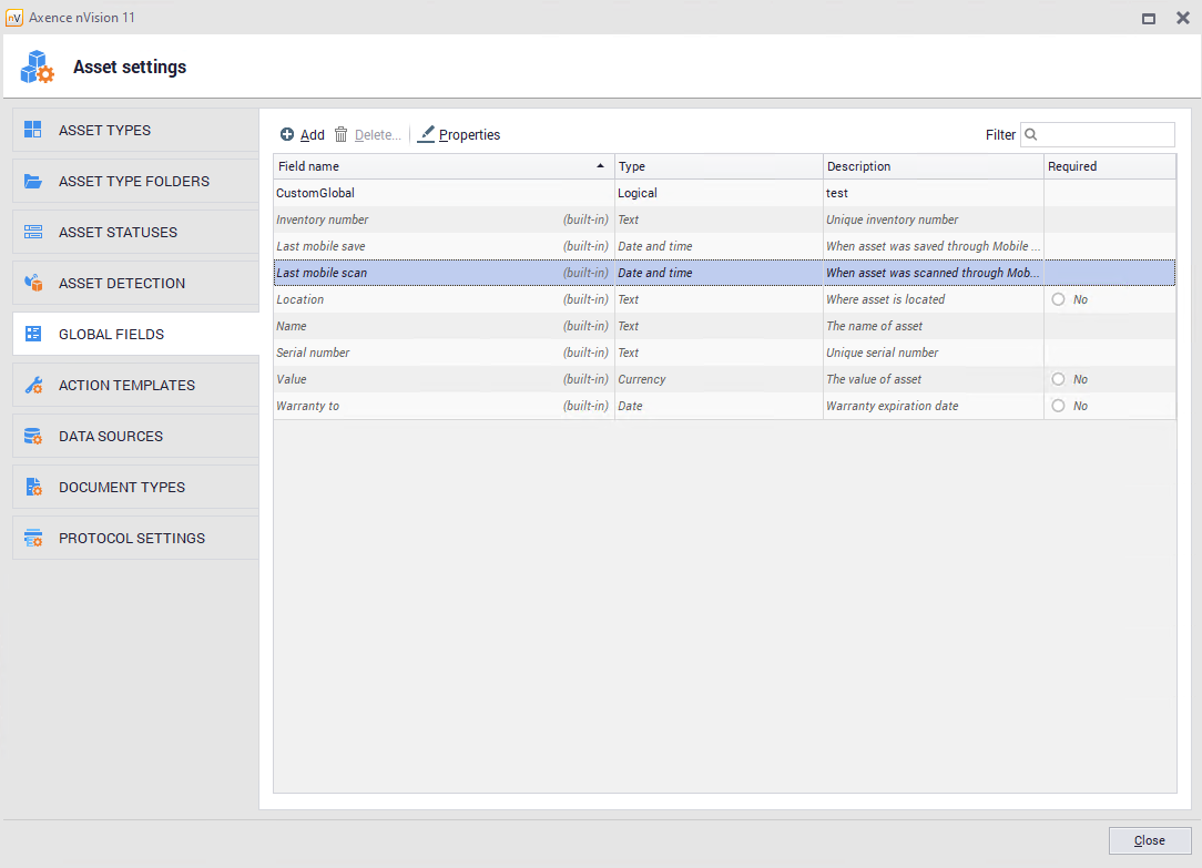 Built-in global fields nVision offers several built-in global fields: •Warranty to, •Location, •Name, •Inventory number, •Serial number, •Last mobile save, •Last mobile scan, •Value.