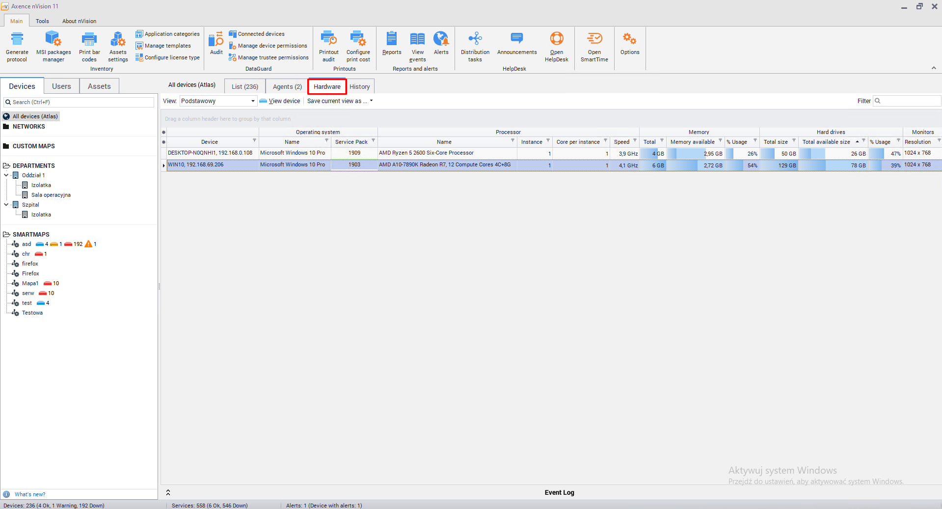 Here you can view all hardware data gathered by Agents installed on monitored computers and hardware scans that have been imported into the program. For ease of use, the option of grouping data using views is enabled. You can use one of the existing views (e.g. All columns, Basic, Multimedia) or create your own.